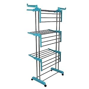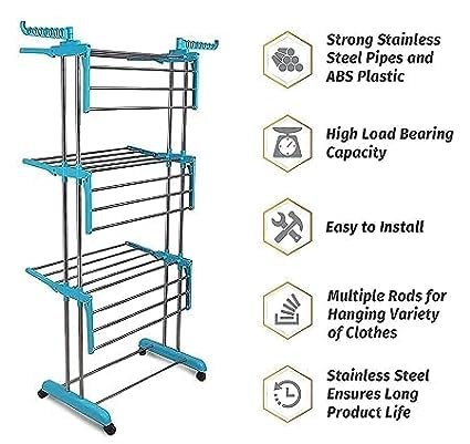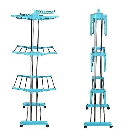 Introducing the AK Ultimate Cloth Drying Stand, your ultimate solution for efficient and hassle-free clothes drying. Crafted with rust-free stainless steel and high-quality ABS material, this 3-tier clothes dryer rack offers durability, stability, and convenience in one sleek design. Its vibrant Cyan Blue color adds a touch of style to your laundry space.