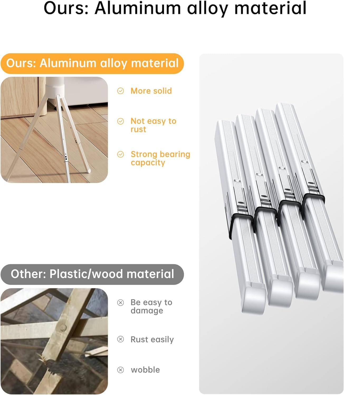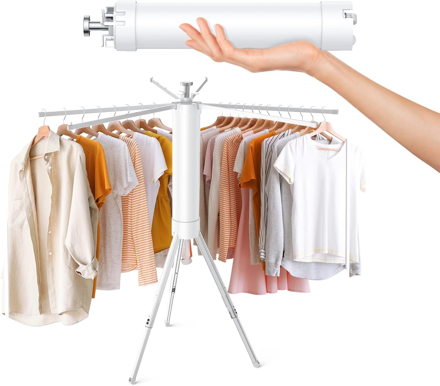 Stylish Design: This laundry drying rack inspired by the design of an octopus, . this laundry rack features 6 concealed drying rods.The hanging rods are made of high-strength alloy aluminum Each rod is equipped with 3 indents on hanger to prevent clothes from slipping off while hanging.The unique tripod structure of the collapsible drying rack can maintain perfect stability in a limited space.