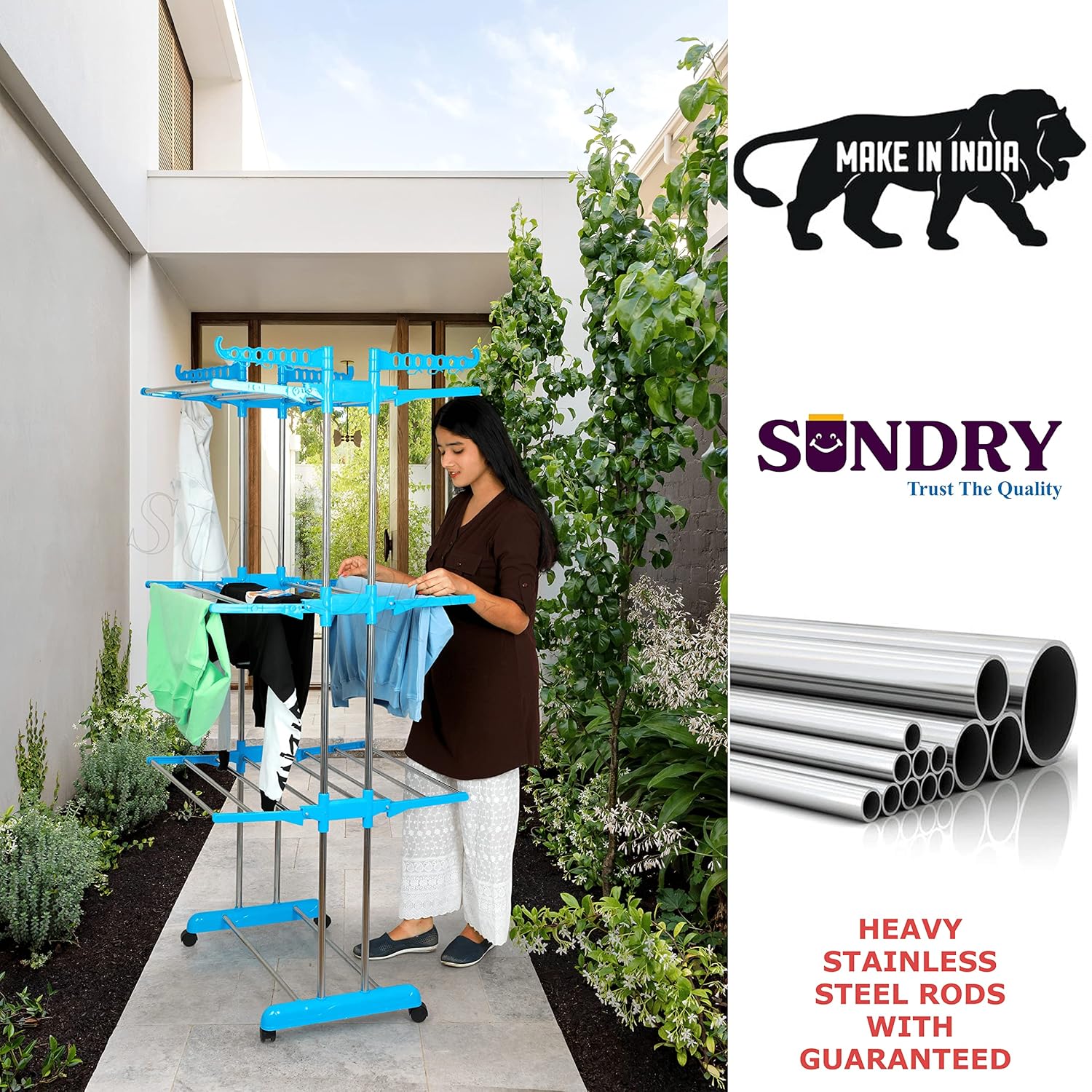 Welcome to the world of LOOT-LEY A place where premium quality and great value go hand in hand. Every LOOT-LEY product is carefully built to deliver 100% premium quality. Right from the materials used, to detailed quality checks, to thoughtful improvements, quality is at the core of everything we do. Do try of our exclusive product !!! LOOT-LEY Stainless Steel Cloth Drying Stand (3-Tier) Premium Material & Stainless Steel Wide Application Scenarios: Suitable for indoor or outdoor use. Towels, Clothes, Shoes & Balcony, Patio, Laundry or Hallway *Easy To Assemble: Easily install it step by step according to the manual one person can complete the assembly under 10 minutes. Collapsible Large Capacity This hanger has 3 levels of tray space, not only can hang wet and dry clothes, but also can be used as a storage space, put some storage boxes, toys, books and so on. In addition, the 3-layer tray can also be folded up behind the door, or the corner of the room to save space. Humanized Design The 360° rotating hook frame helps you to air and dry clothes more easily and in various ways. Roller with Buckle You can place the clothes rack more freely and find the position of sunlight at any time Foldable & Easy to Store You can easily fold up the sides of the bracket, and when you fold it up you’ll find that it takes up almost no space Multiple drying area features plenty of multi-use place for laying garment flat to dry. Foldable size can be stored anywhere when not in use.