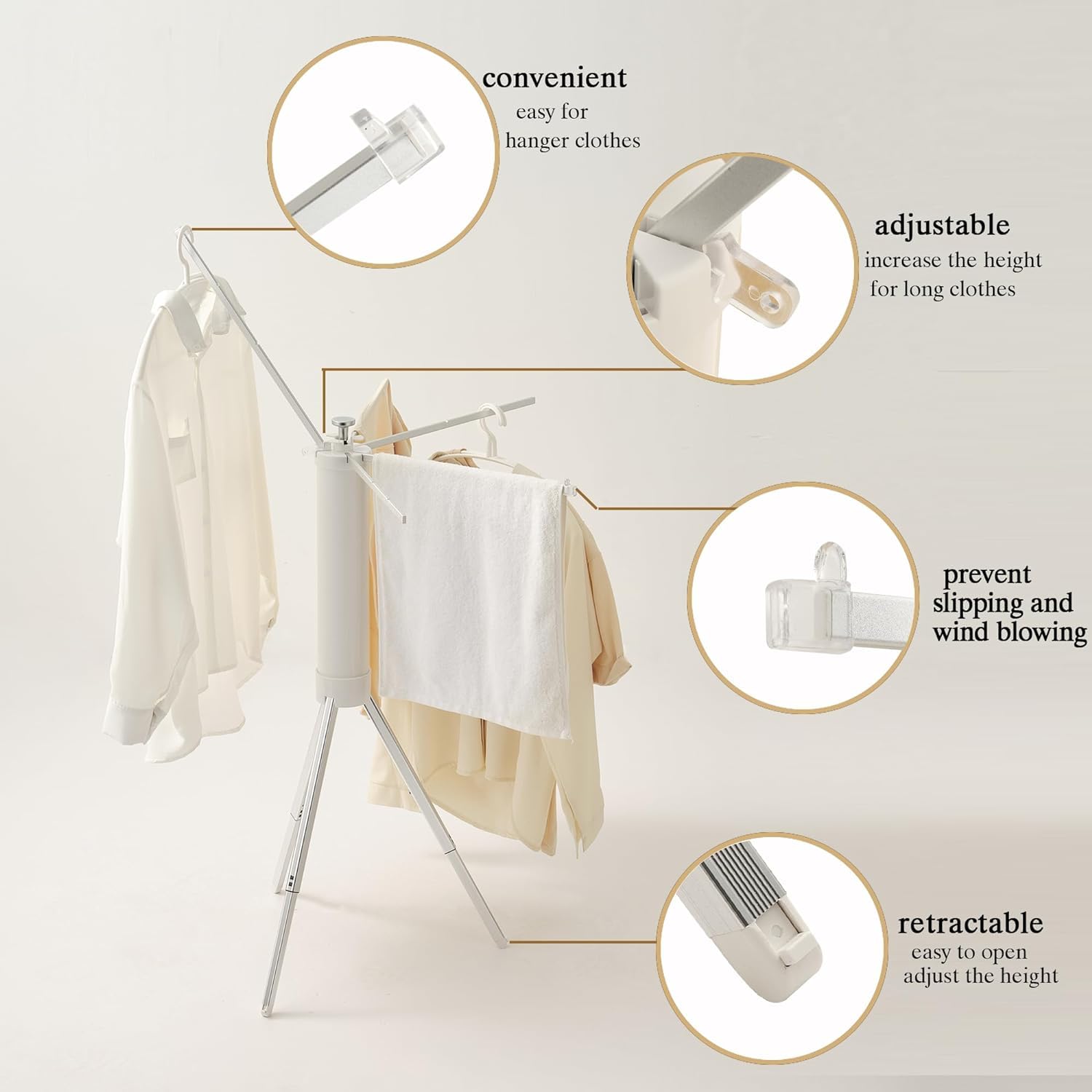 Stylish Design: This laundry drying rack inspired by the design of an octopus, . this laundry rack features 6 concealed drying rods.The hanging rods are made of high-strength alloy aluminum Each rod is equipped with 3 indents on hanger to prevent clothes from slipping off while hanging.The unique tripod structure of the collapsible drying rack can maintain perfect stability in a limited space.
