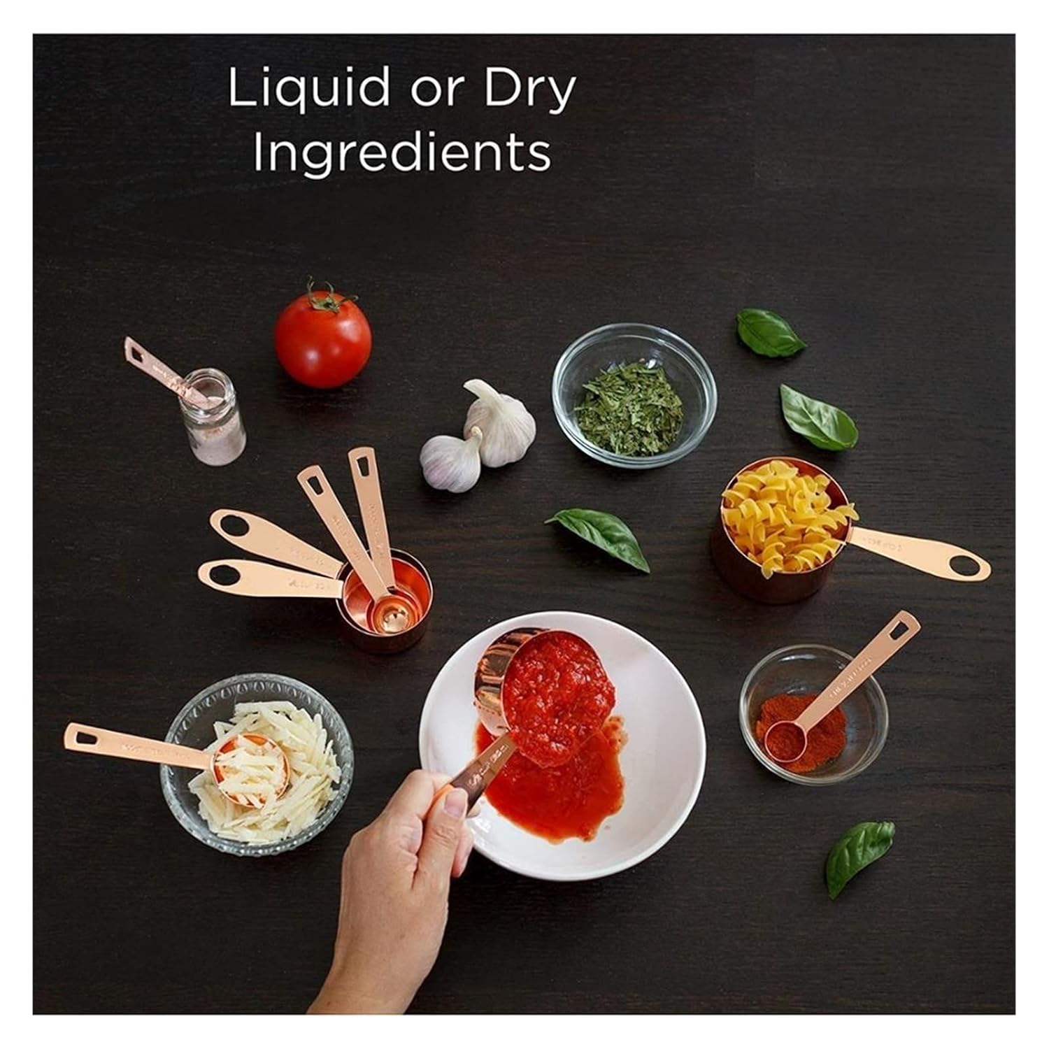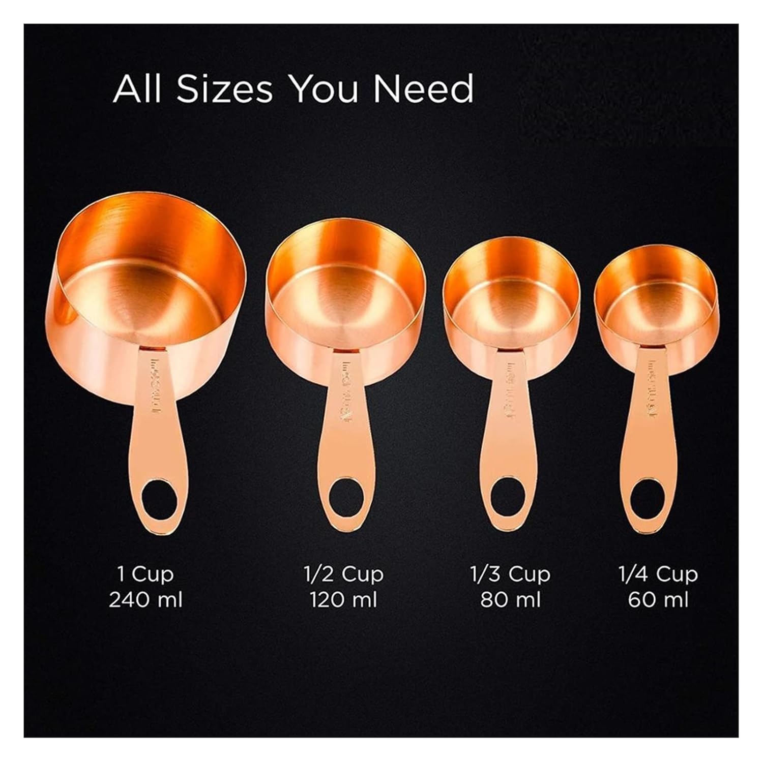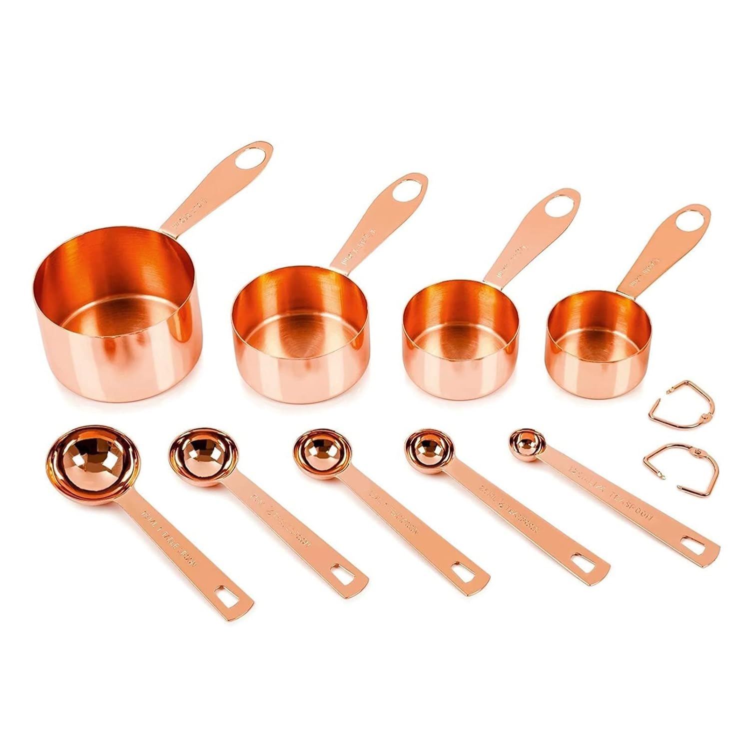 ⭐ 4 CUPS + 5 SPOONS – CUPS: 1 cup (240 ml), 1/2 cup, 1/3 cup, 1/4 cup. SPOONS: 1 tablespoon (15 ml), 1/2 tablespoon, 1 teaspoon (5 ml), 1/2 teaspoon, 1/4 tsp. + 2 copper D-rings to hook them together