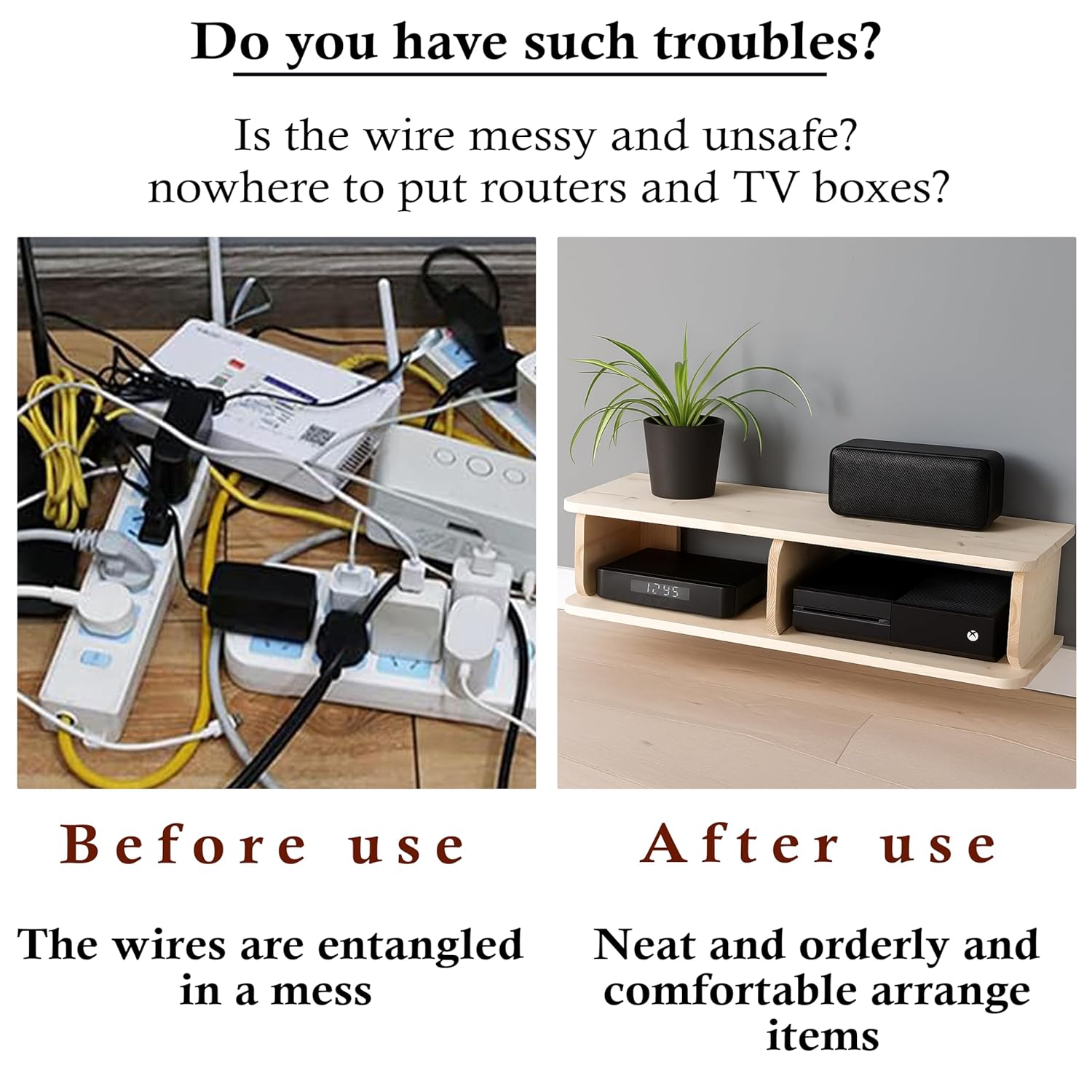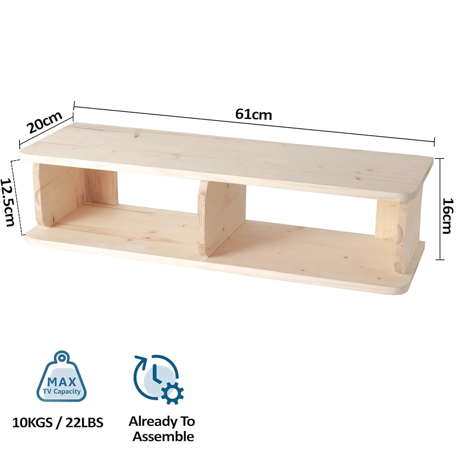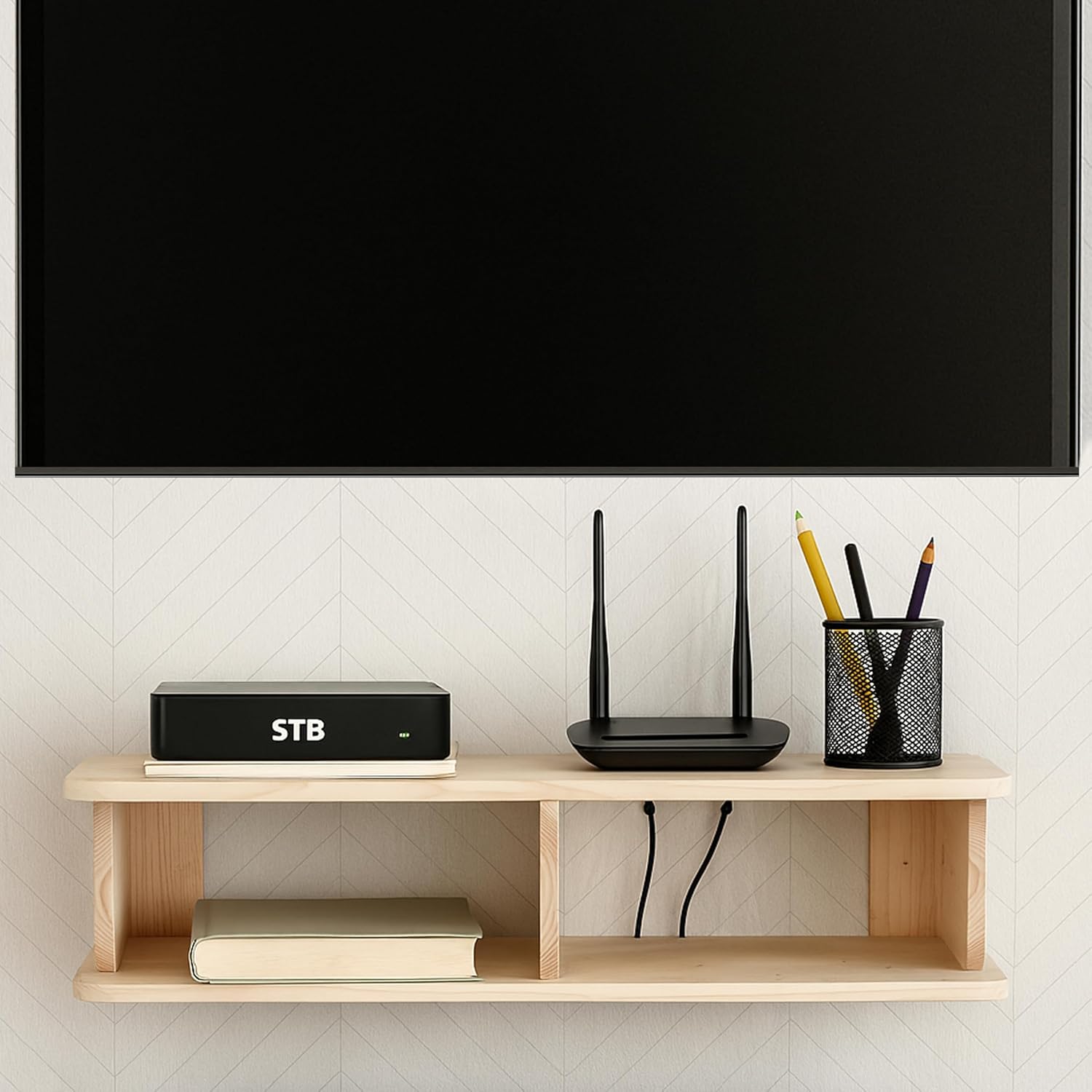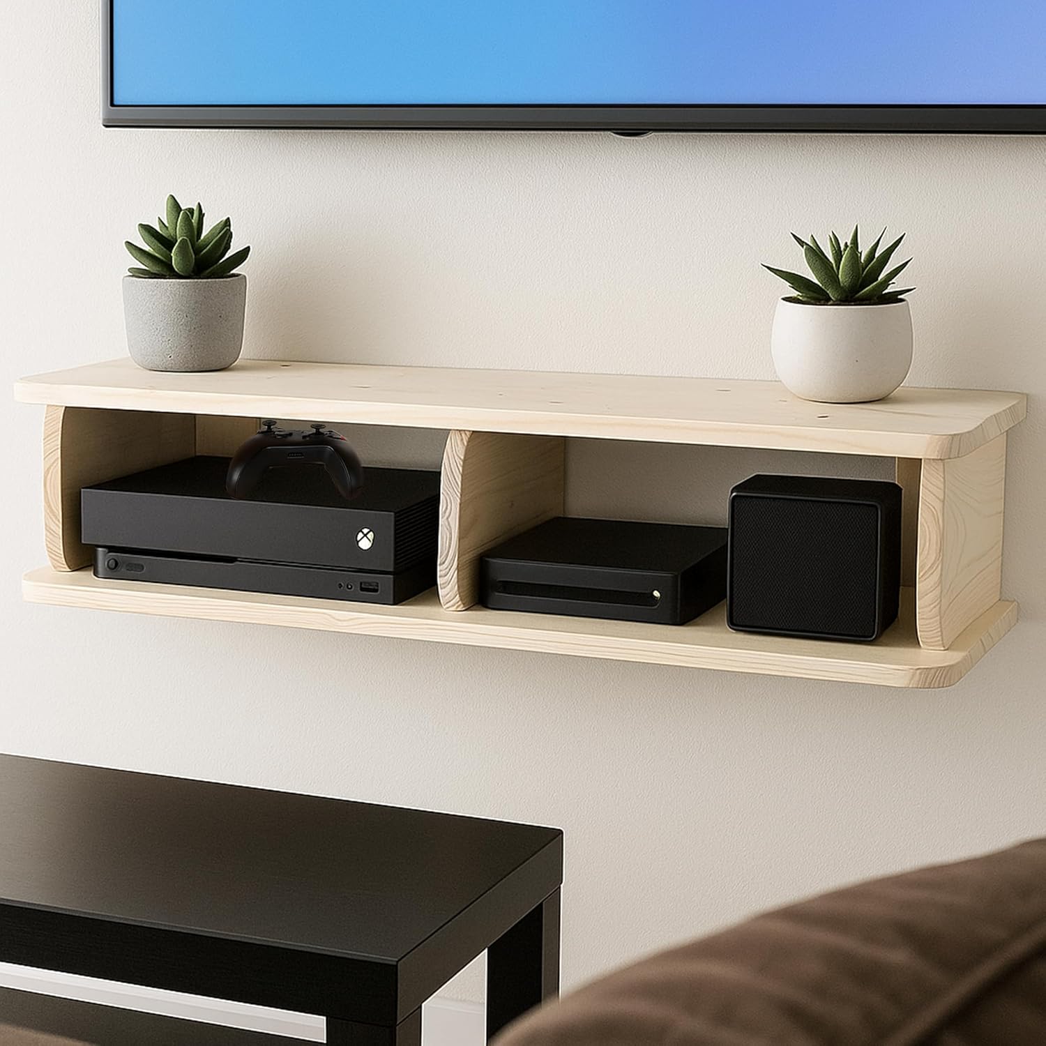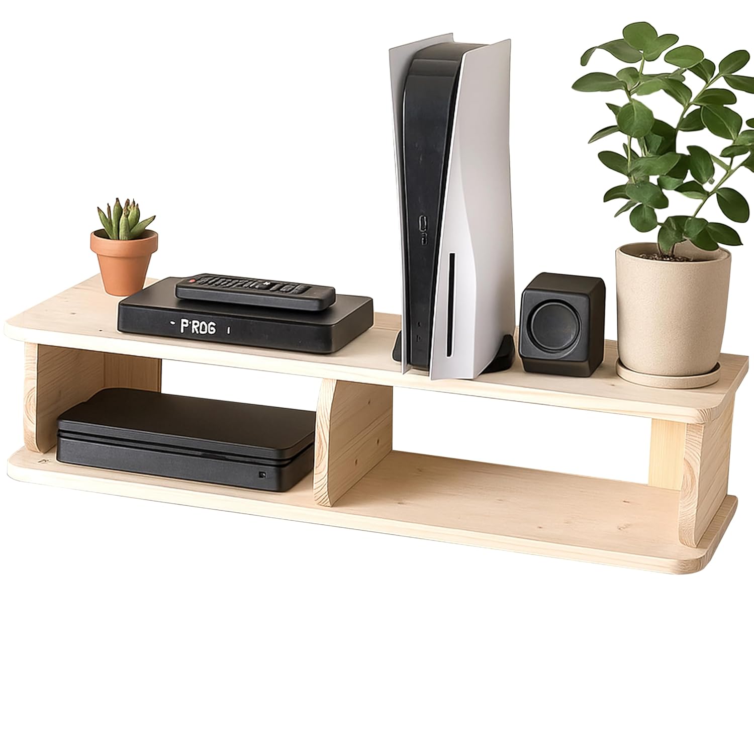 Transform your living space with this elegantly crafted floating TV shelf from Decazone. Made from premium solid pine wood and finished with natural wax coating, this wall-mounted media console combines timeless style with practical functionality. The thoughtfully designed shelf provides ample space for organising your entertainment devices, from Wi-Fi routers to gaming consoles, while maintaining a clean, minimalist aesthetic. Its natural wood grain, enhanced by the protective wax finish, adds warmth and character to any room. The robust solid wood construction ensures superior durability compared to standard engineered boards, making it a worthwhile investment for your home. Featuring clever cable management solutions, this versatile unit helps keep your space tidy and organised. Whether mounted in your living room, bedroom, or media room, this handcrafted shelf seamlessly integrates with various décor styles. The natural finish allows the inherent beauty of pine wood to shine through, creating a sophisticated yet understated presence in your space.