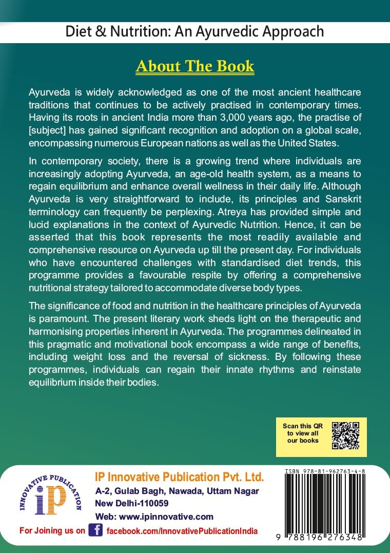 Ayurveda is widely acknowledged as one of the most ancient healthcare traditions that continues to be actively practised in contemporary times. Having its roots in ancient India more than 3,000 years ago, the practise of [subject] has gained significant recognition and adoption on a global scale, encompassing numerous European nations as well as the United States. In contemporary society, there is a growing trend where individuals are increasingly adopting Ayurveda, an age-old health system, as a means to regain equilibrium and enhance overall wellness in their daily life. Although Ayurveda is very straightforward to include, its principles and Sanskrit terminology can frequently be perplexing. Atreya has provided simple and lucid explanations in the context of Ayurvedic Nutrition. Hence, it can be asserted that this book represents the most readily available and comprehensive resource on Ayurveda up till the present day. For individuals who have encountered challenges with standardised diet trends, this programme provides a favourable respite by offering a comprehensive nutritional strategy tailored to accommodate diverse body types. The significance of food and nutrition in the healthcare principles of Ayurveda is paramount. The present literary work sheds light on the therapeutic and harmonising properties inherent in Ayurveda. The programmes delineated in this pragmatic and motivational book encompass a wide range of benefits, including weight loss and the reversal of sickness. By following these programmes, individuals can regain their innate rhythms and reinstate equilibrium inside their bodies.