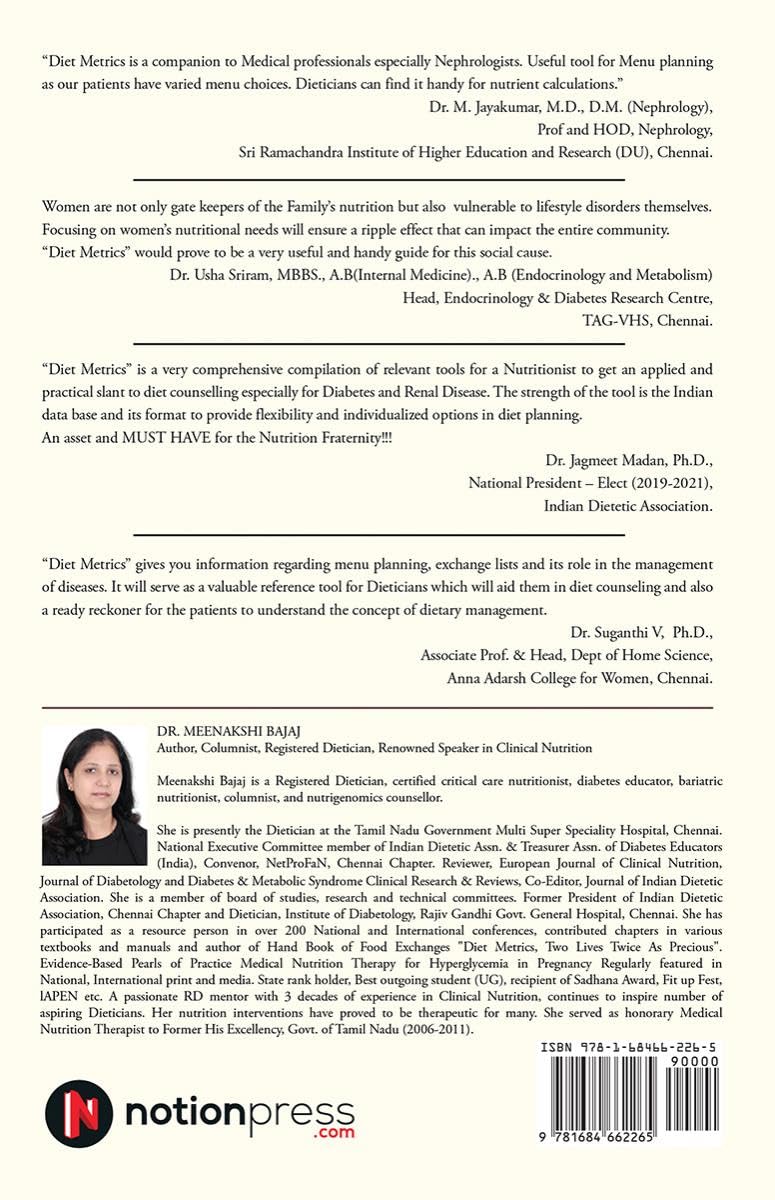 DIET METRICS is a user- friendly tool providing an insight on Standard Meal Planning Exchanges, Glycemic friendly and Renal Food Exchanges. Each of these exchanges have been extracted and summed up from the most standardized, recent and validated, Indian Food Composition Table (2017). However, to ensure that this tool is more effective, nutrition care process details along with cultural variations will have to be taken into consideration. Portion size determination is also a prerequisite to ascertain nutrient adequacy of any dietary regime. DIET METRICS would prove to be a simple and handy tool to convert the nutrition prescription with near accuracy and ease to a practical menu plan, both at an individual and community level. Medical and allied health care professionals may find DIET METRICS as a valuable addition to their bookshelf.