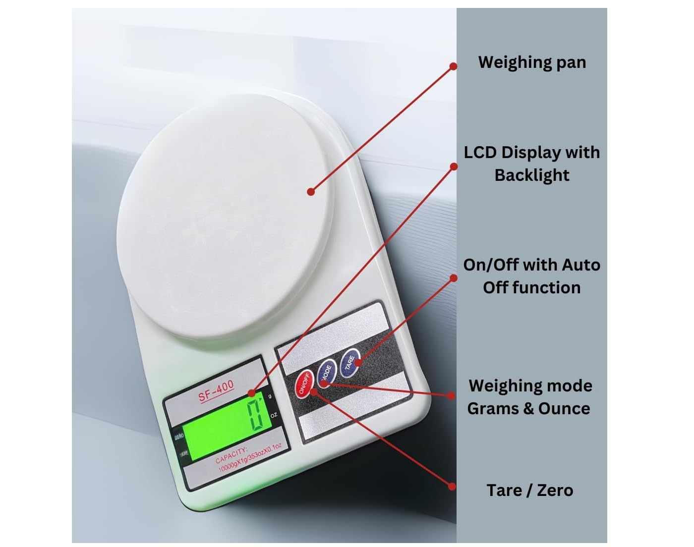 Easy-to-read backlit screen with multiple unit options (g, oz, lb, ml).