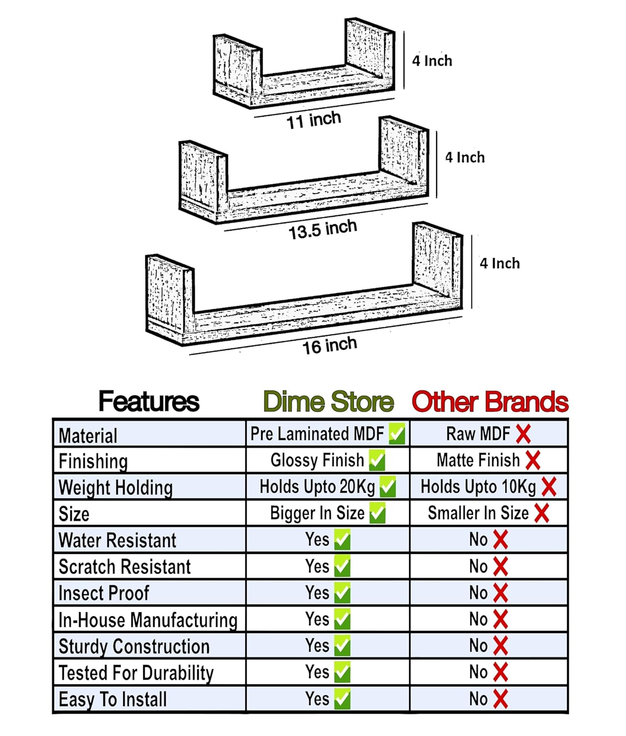 SIZE OF WALL SHELVES : Beautifully designed for Indian Homes to work as perfect Wall shelfs for Living Room, have three shelfs of different size as 16 inches. 13.5 inches and 11 inches in length, width and height are same