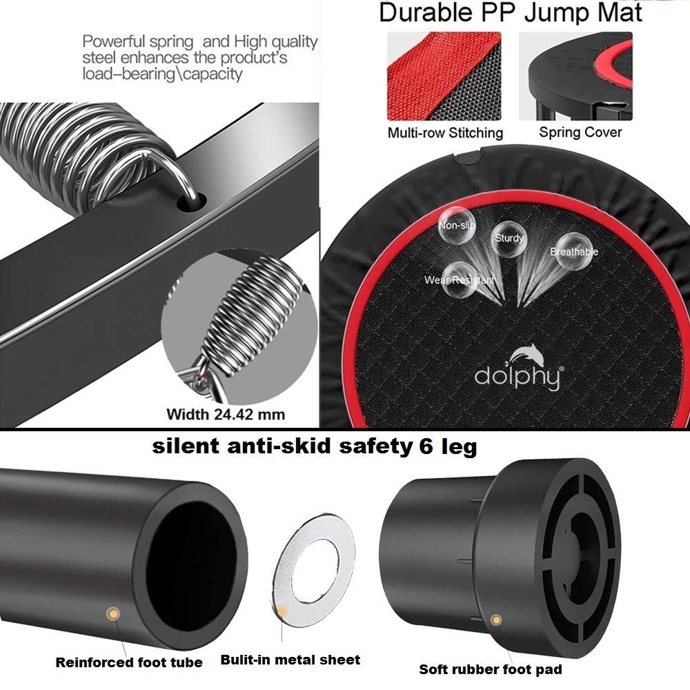 UPGRADED EASY ASSEMBLY DESIGN – The Dolphy trampoline comes with 24 resistant springs and 6 durable steel legs, just untie the protective rope, and insert it into the screw onto the frames without twisting the legs. No tools are needed! , you can shorten the assembly time effectively with this mini trampoline.