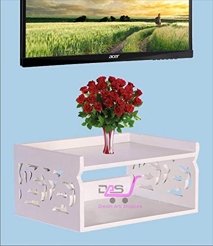 Dream Arts Shoppee Set Top Box Stand Wall Shelf & WiFi Modem Display Rack for Living with Side Craving Cutting Design (White)