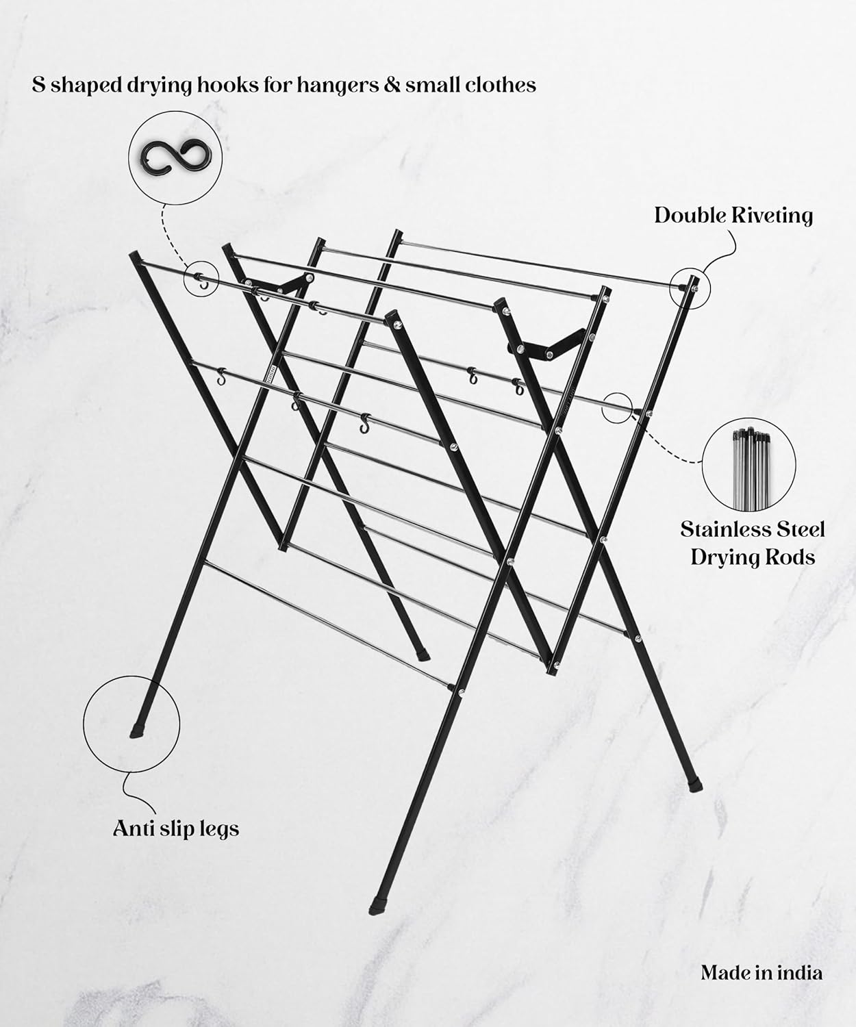 Wide Drying Bars: The drying bars are designed with a wide and flat surface to prevent creasing or marking on clothes. This feature is especially useful for delicate fabric