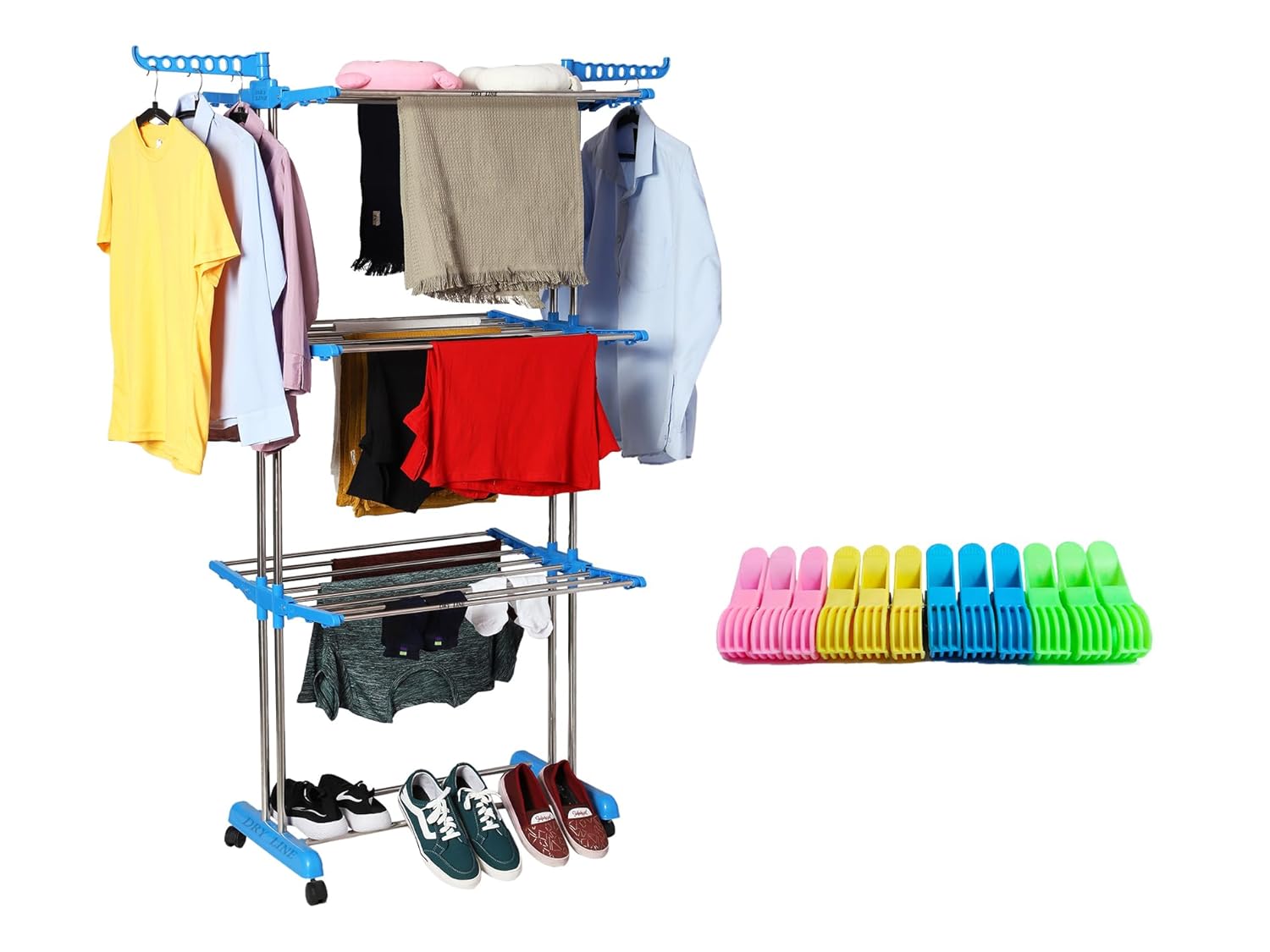Amazon Brand – Solimo Premium Extra Large Cloth Drying Stand, Stainless Steel (Natural SS & Blue)