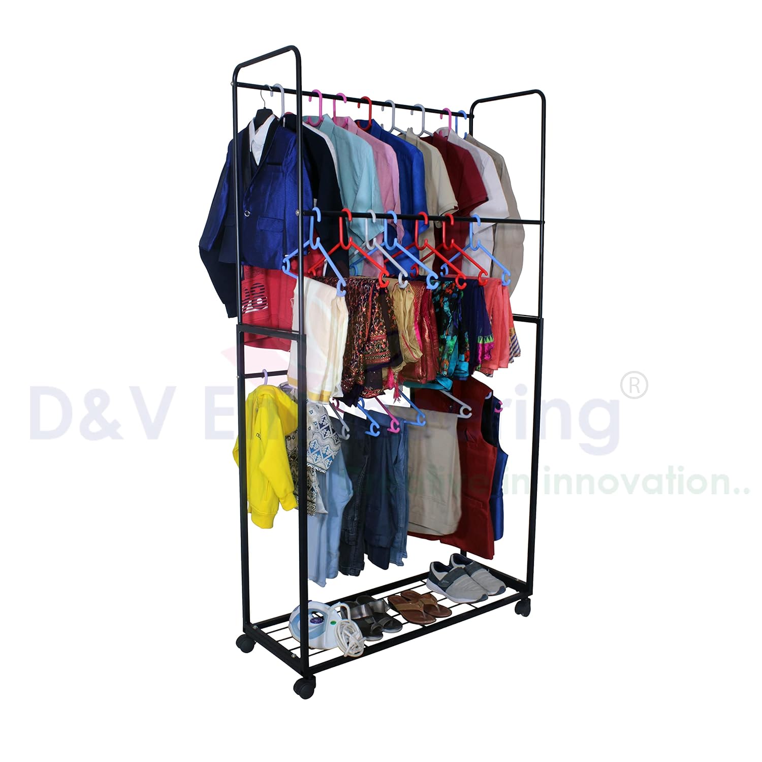 💪 Heavy Duty Design: Built to hold heavy loads, this rack can support a large number of clothes without compromising stability.