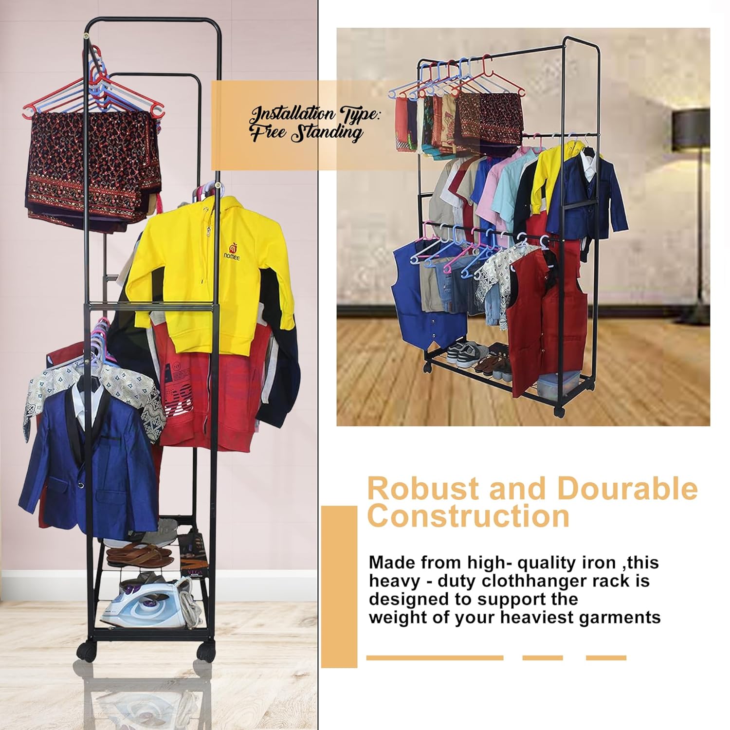 🧥 Coat & Garment Stand: Ideal for use in bedrooms, hallways, entryways, or boutiques as a convenient garment stand.