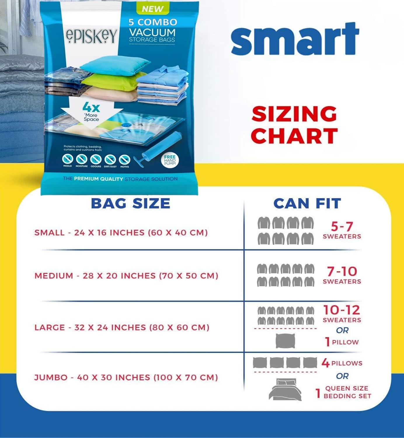Episkey Reusable Space Saver Bag, Vacuum Storage Bag, Zip lock , Compression Bag for Home & Travel (Pack of 5) 3 Medium Size & 2 Large Size With Hand Pump .These bags help you store hefty items and seasonal goods accordingly. Woolen clothes can be kept free of bugs and odors, and perfectly in condition. The triple-seal formula helps to prevent microbes, zero air passage. Maximizes your space making travel and organizing a stress-free job. Comes with a double-seal zip to ensure that the items in the bag stay crisp and compact.