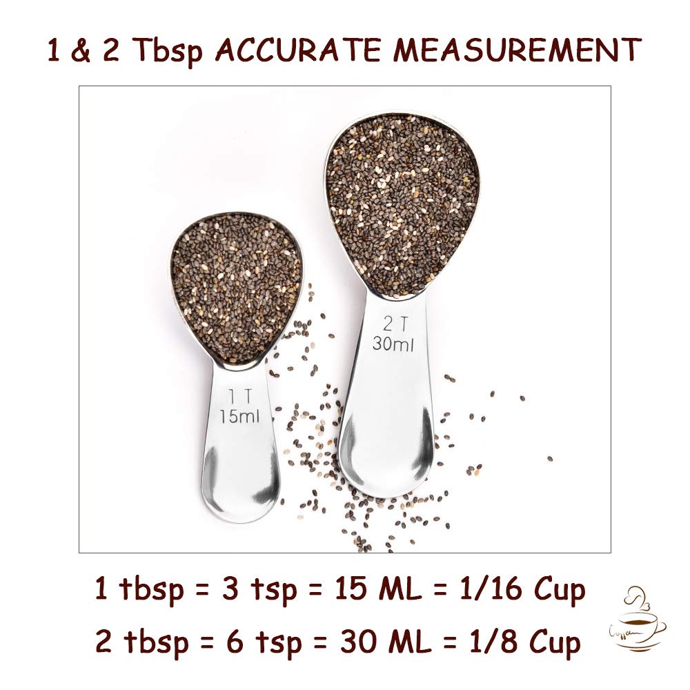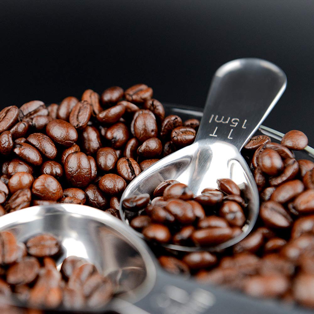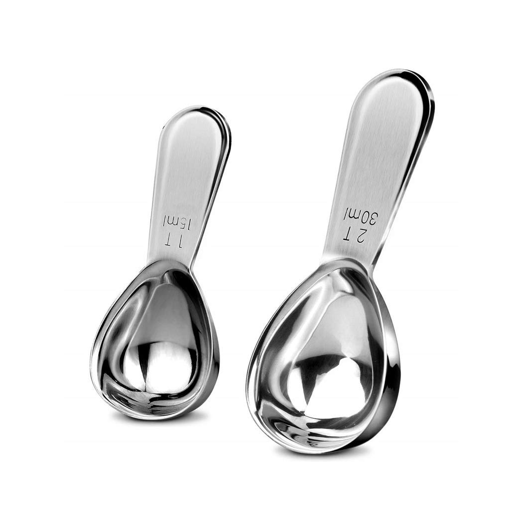✿ENGRAVED & ACCURATE MEASUREMENT—1 T 15ml and 2 T 30ml. The measurements on our scoops are engraved with both USA and metric units for accurate measuring with every use. With this scoop you get exactly the 1 tablespoons (1/16 cup=15ml) or 2 tablespoons (1/8 cup=30ml) coffee. EASY TO READ. These marks will never be erased, our measuring spoons are made from premium, heavy duty, rust proof 18/8 stainless steel, durable service