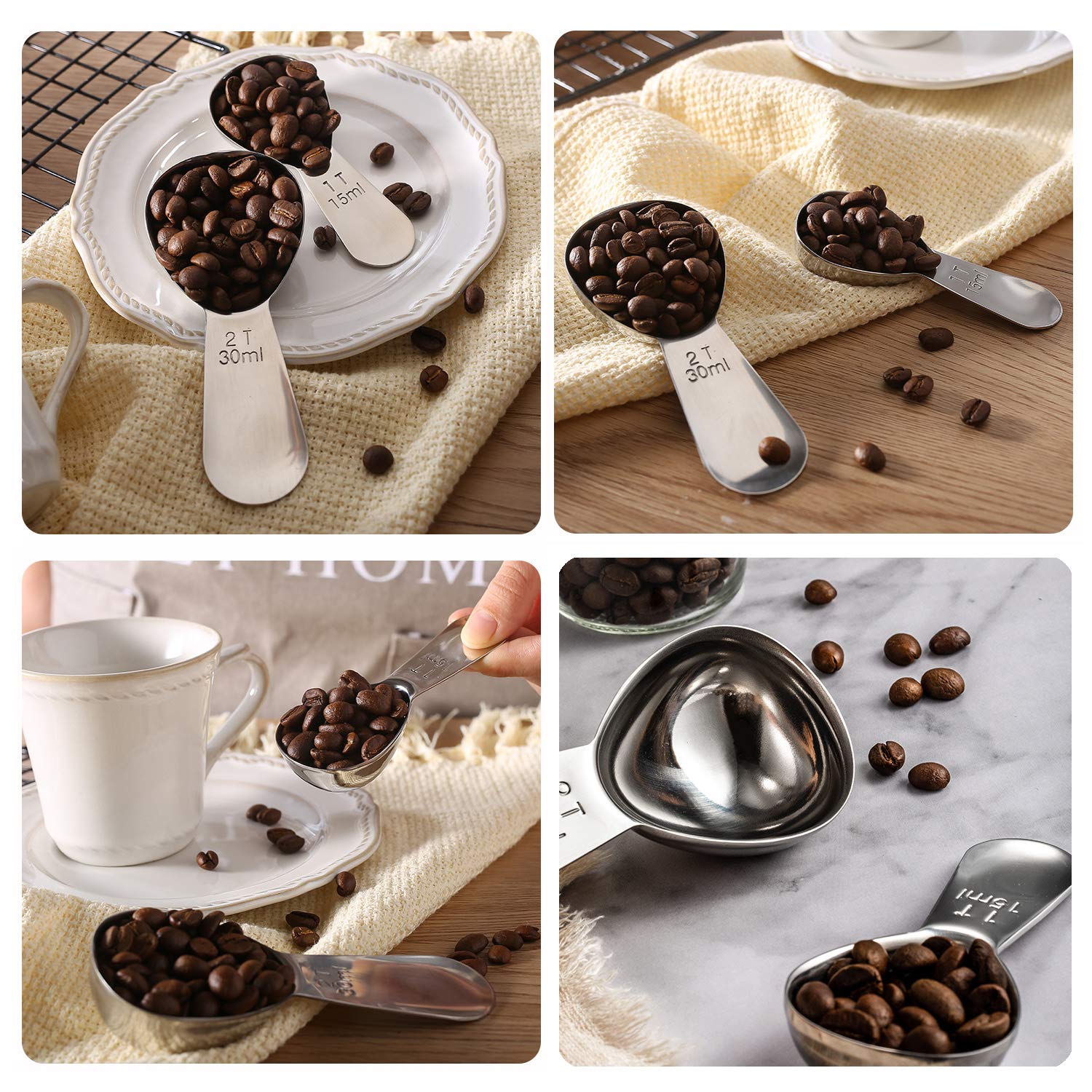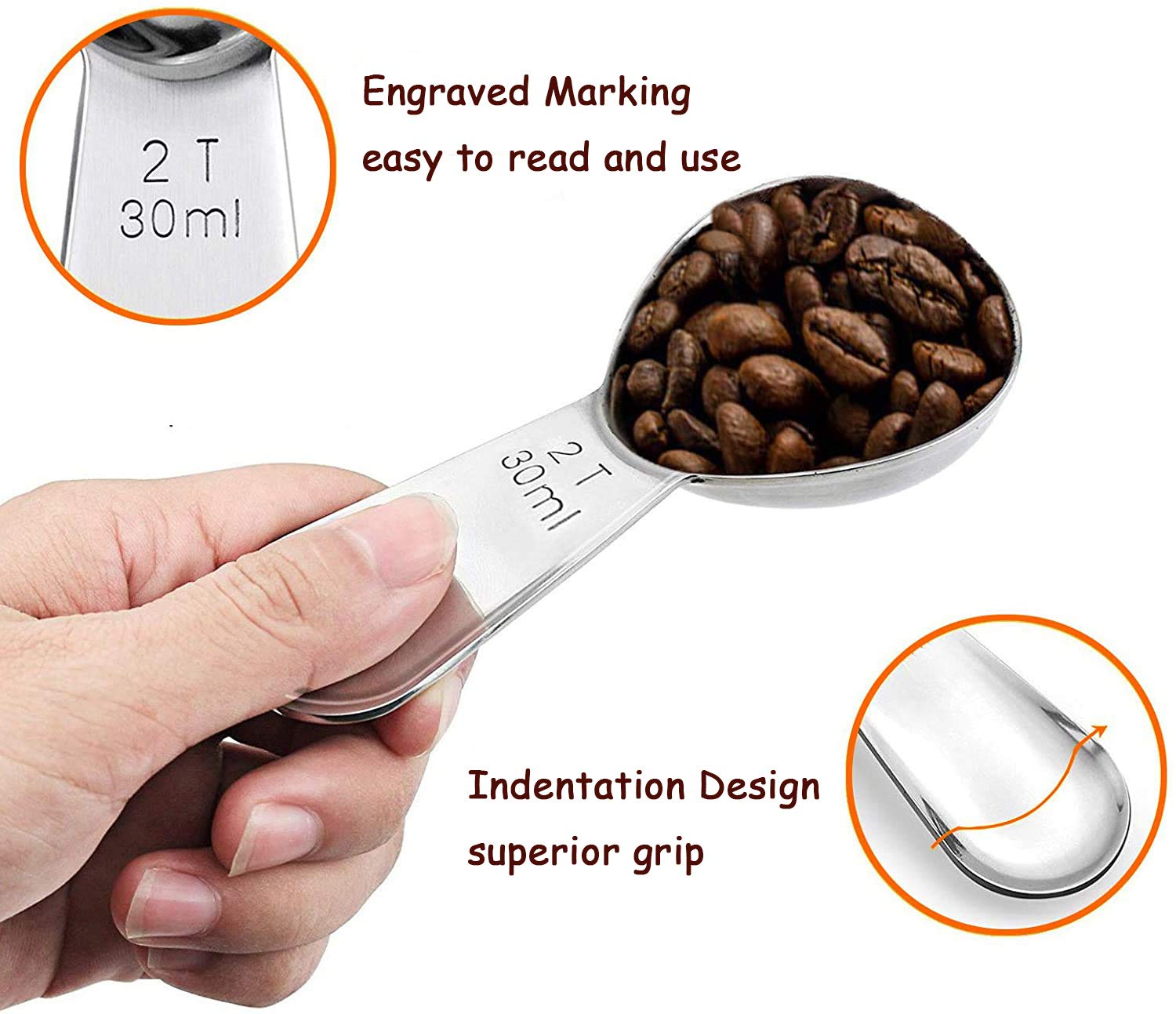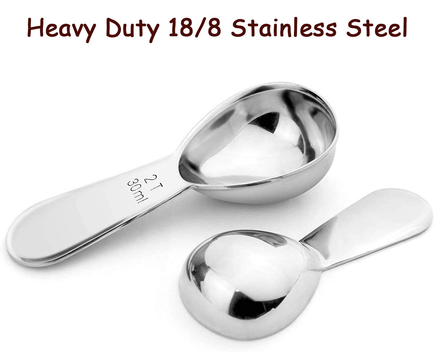 ✿ENGRAVED & ACCURATE MEASUREMENT—1 T 15ml and 2 T 30ml. The measurements on our scoops are engraved with both USA and metric units for accurate measuring with every use. With this scoop you get exactly the 1 tablespoons (1/16 cup=15ml) or 2 tablespoons (1/8 cup=30ml) coffee. EASY TO READ. These marks will never be erased, our measuring spoons are made from premium, heavy duty, rust proof 18/8 stainless steel, durable service