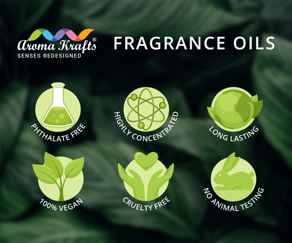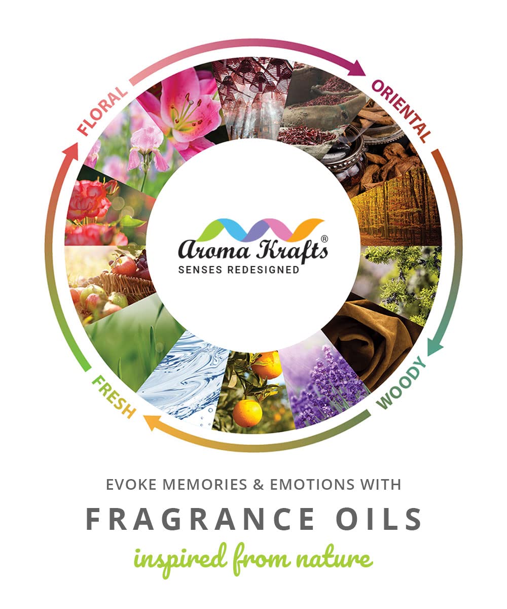 Redesign your senses with our collection of nature inspired fragrance oils. We’ve earned the reputation of offering the finest fragrance oils which are beyond the typical. Our fragrances create an experience of their names so that you can indulge in the bliss of nature. These premium quality fragrance oils are made from natural essential oils, extracts & resins blended with organic compounds and nature-identical aromatic ingredients. The resulting mix is a unique, wonderful harmony of aroma which is pure & undiluted. These are supplied in Amber colored bottles with built-in dropper for easy and mess free application. Suitable for use in Soap Making, Candle Making, other DIY Bath & Body Products (like Bath Bomb, Bath Salt, Scrub, Shampoo, Bubble Bath, Lotion, Moisturizer, Body Butter, Cream) Aroma Diffuser, Room Spray etc.