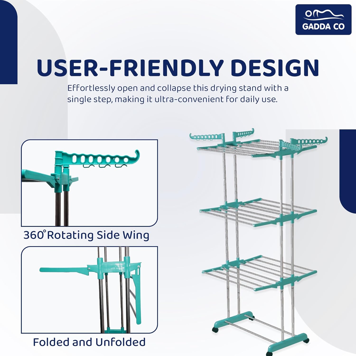 Home Home GADDA CO Premium Cloth Drying Stand | 3-Tier Heavy Duty Foldable Rack with Wheels, 24 Hanger Rods & Adjustable Side Wings | Anti-Rust Steel | Teal Green | 65 x 31 x 17 inch | Indoor & Balcony Use