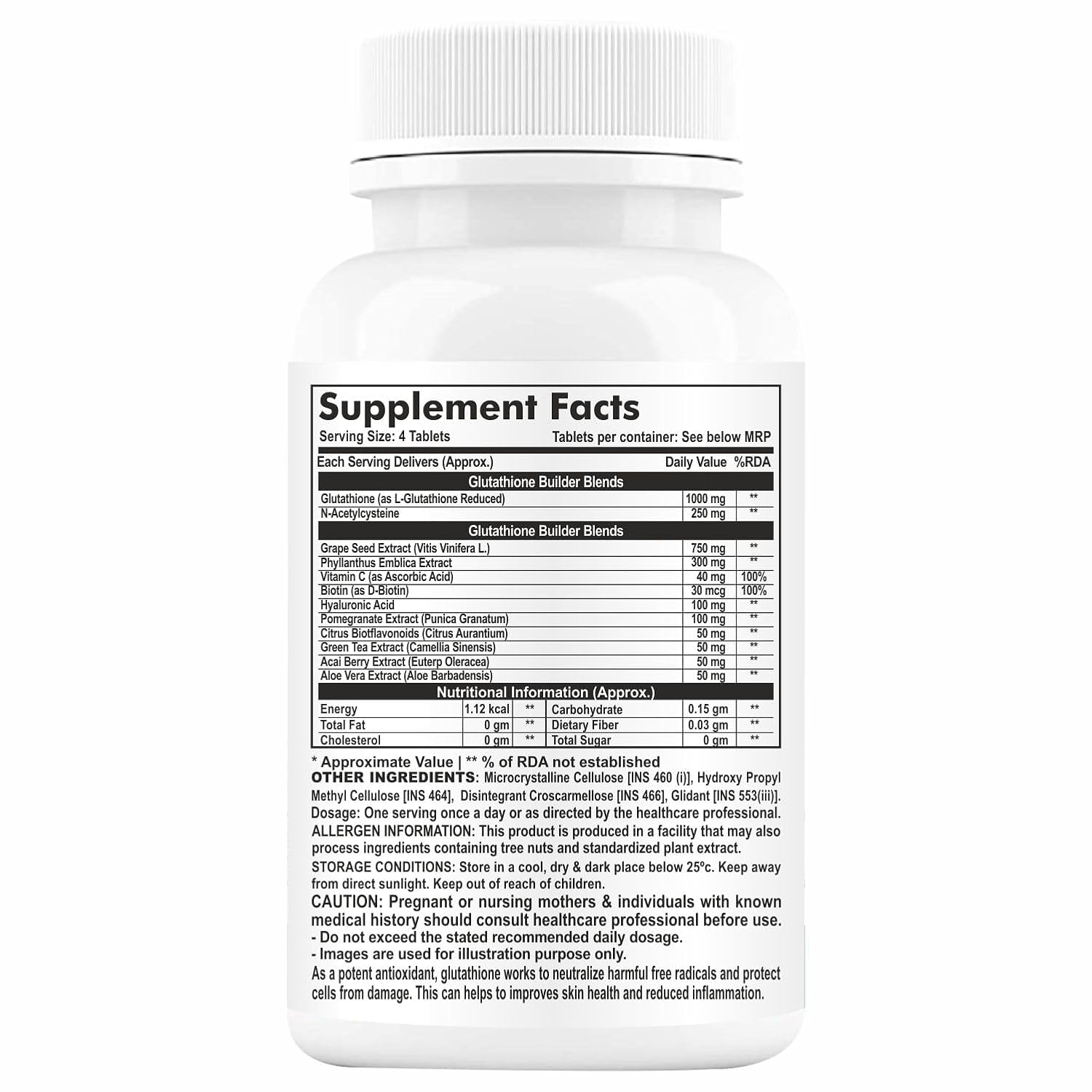 Glutathione helps in deep cleansing the skin and also helps in restoring the glow for radiant skin.L- Glutathione tablets are designed to provide the antioxidant support your skin requires to stay looking young, healthy, and Hydrated. It combines Skin vitamins such as Vitamin C, vitamin E, Biotin, Grape Seed Extract, and Alpha Lipoic Acid, helps reduce melanin production, which is responsible for skin darkening and dullness and improves natural skin radiance and even texture