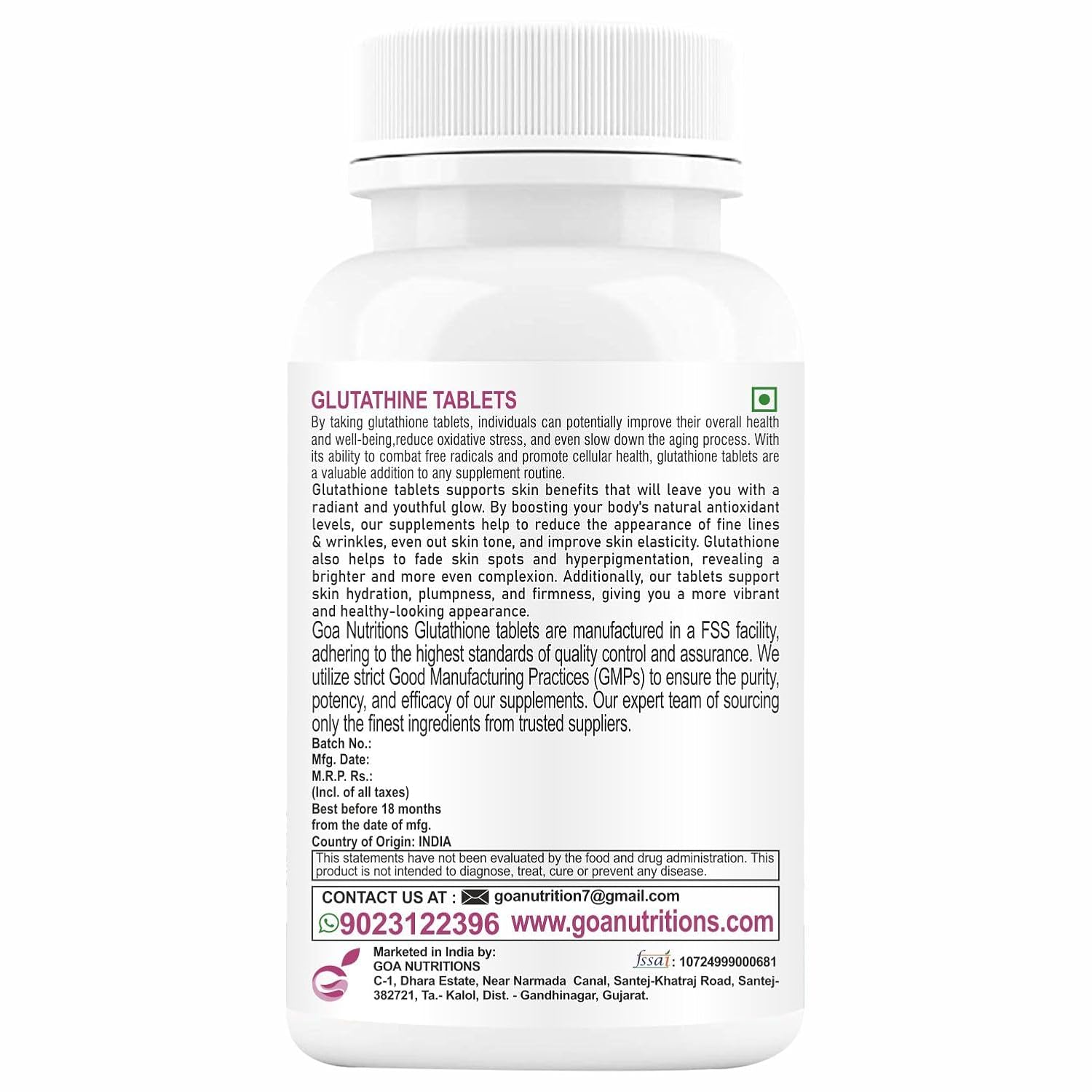 The enteric coating of “Acid-Resistant” vegan Tablets adds to the stability of the product, allowing for better absorption and overall effectiveness. You buy supplements to help your health, and ER keeps the chemicals safe until they’re fully absorbed by your body, increasing their advantages..No Artificial Color, Flavor or Sweetener, No Preservatives, No Sugar, No Starch, No Corn, No Egg, No Lactose, No Gluten, Glutathione Tablets are manufactured in Good Manufacturing Practices unit (GMP)