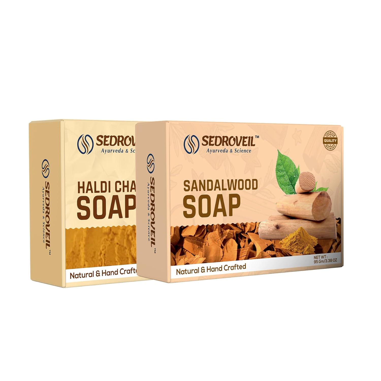 Discover the richness of Ayurveda with the SEDROVEIL Haldi Chandan & Sandalwood Soap Combo, crafted to give your skin a natural glow and deep nourishment. The Haldi Chandan Soap combines turmeric’s purifying power and sandalwood’s calming properties to reduce blemishes, improve skin tone, and provide a soothing feel. The Sandalwood Soap offers a gentle cleanse, leaving the skin soft, supple, and refreshed with every wash. Both soaps are handmade using natural ingredients, free from harsh chemicals, parabens, and sulfates, making them perfect for daily use on all skin types. Elevate your skincare routine with these natural bars for radiant, healthy-looking skin.