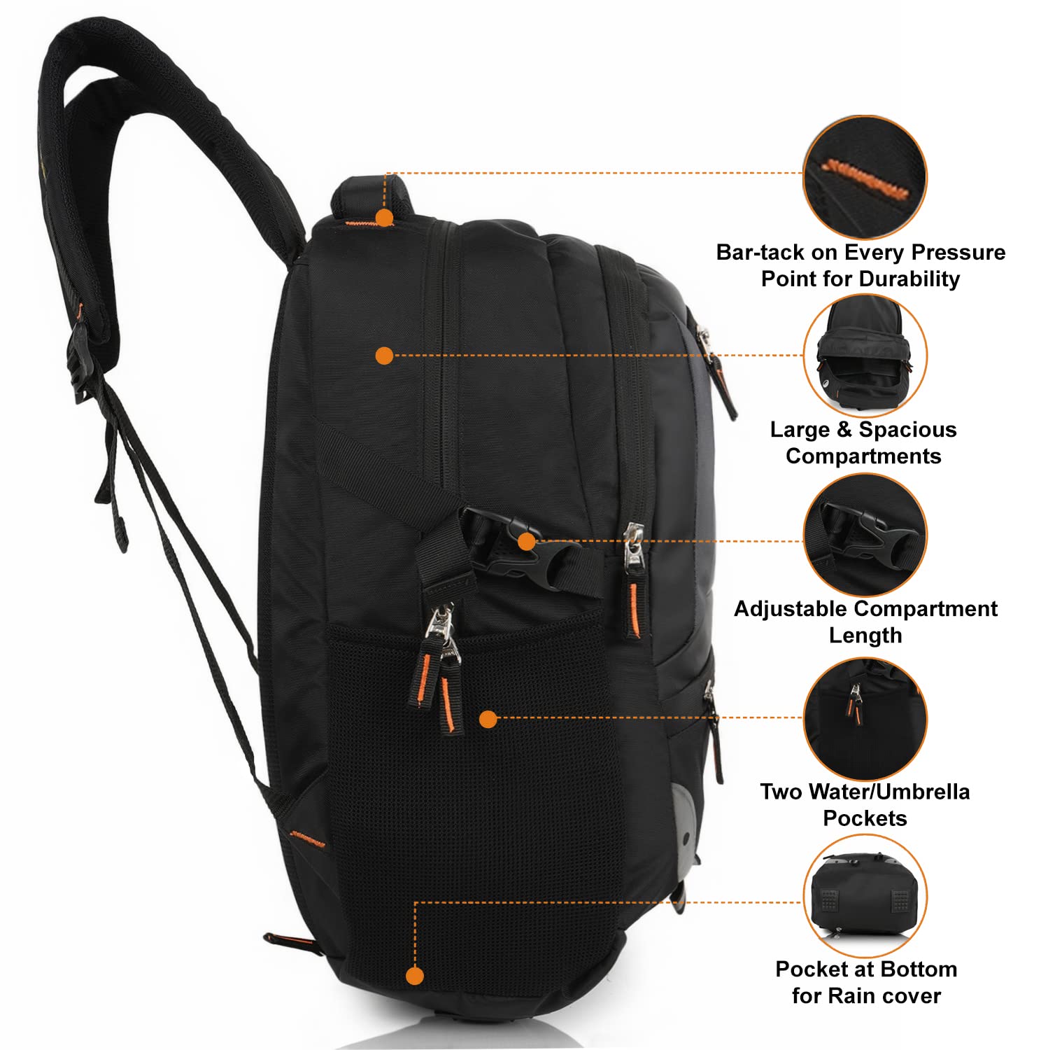 FEATURES: Rain Cover, upto 17 inch Laptop compartment, Internal Organiser(Small Pockets), Strong and durable zippers, Adjustable Shoulder Handles (Straps) , 2 Bottle/Umbrella holders , Padded Handle , Padded Laptop Compartment , Ergonomic Design, Reflector Logo, etc