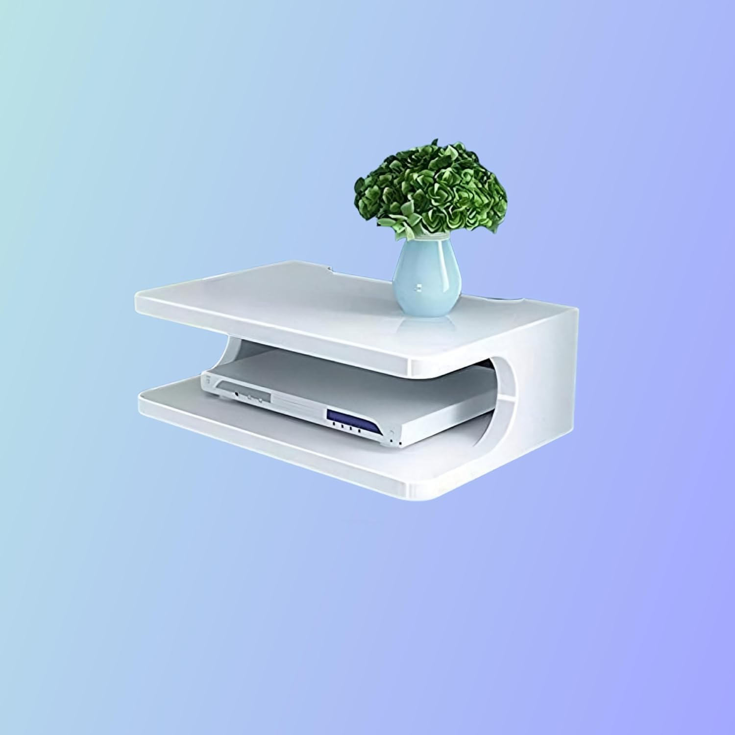 Transform your entertainment space with this sleek floating wall mount TV box shelf. The modern, minimalist design features a clever two-tier configuration that keeps your media devices organised and accessible. The upper shelf provides a perfect display surface for decorative items, while the curved lower compartment neatly houses your cable box, gaming console, or streaming device. Crafted in pristine white, this media console stand seamlessly blends with any interior décor scheme. The floating design not only creates an illusion of space but also makes cleaning underneath effortless. Its sturdy construction ensures stable support for your entertainment accessories while maintaining a sophisticated aesthetic. Perfect for contemporary homes where style meets functionality, this wall-mounted shelf helps eliminate cable clutter and creates a clean, organised entertainment area.