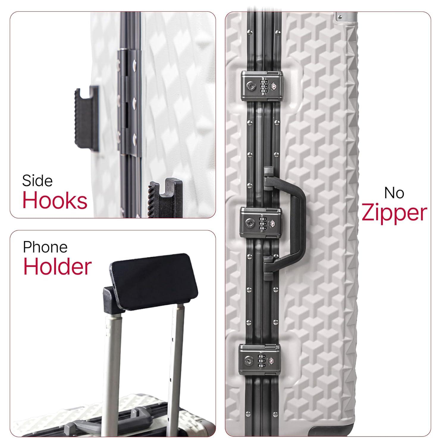 ADDED ACCESSORIES This trolley luggage is thoughtfully designed with an integrated bottle/cup holder, phone holder, and bag hook, providing effortless access to your essentials while on the move.