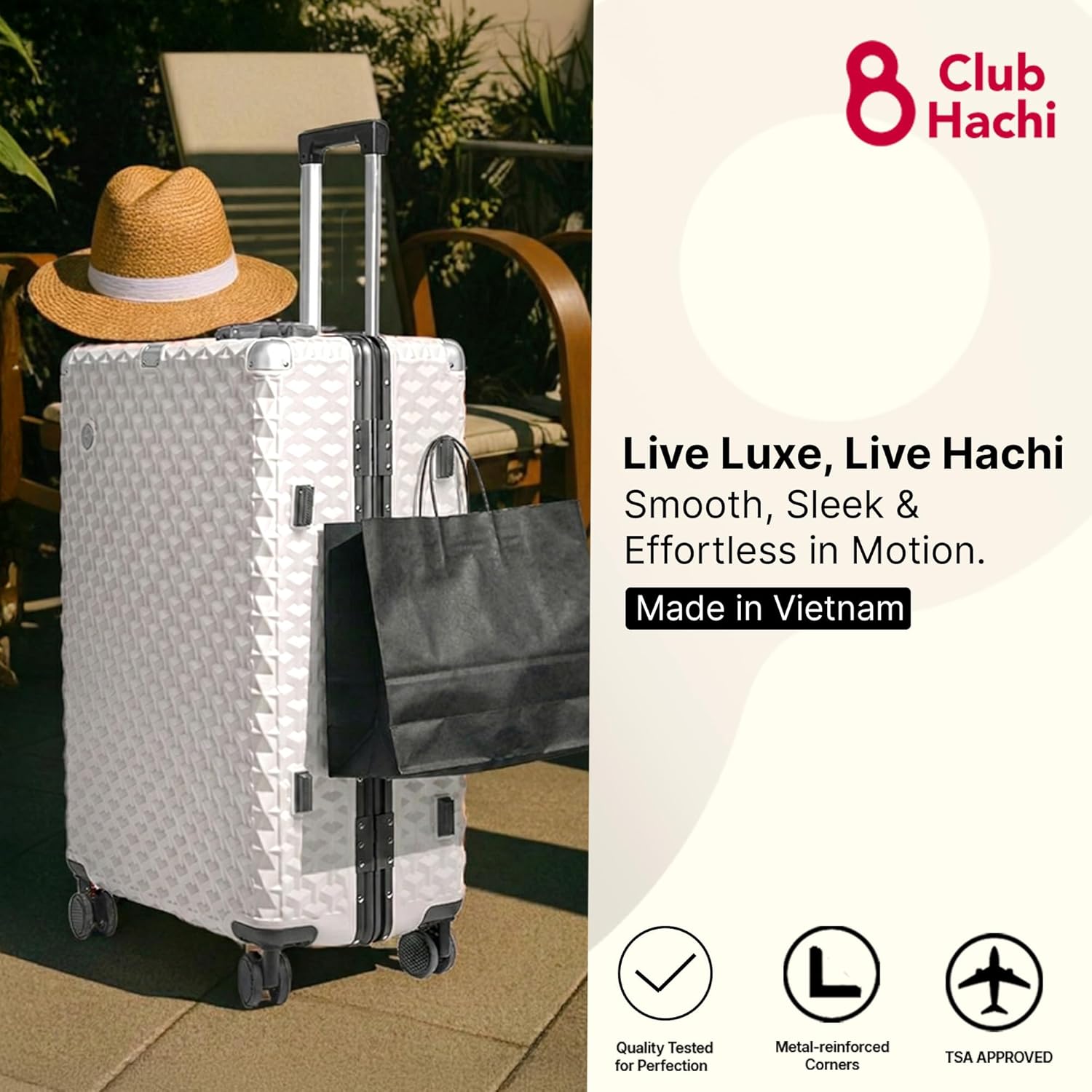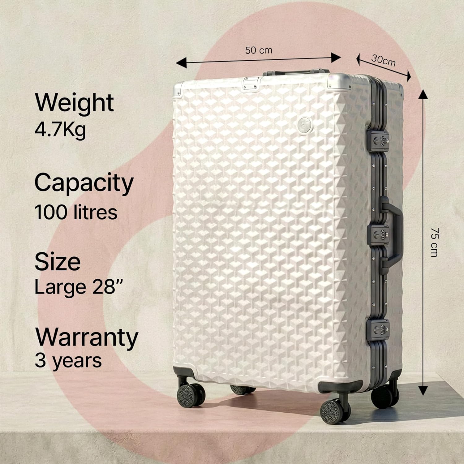 POLYCARBONATE SHELL Made in Vietnam from 100% polycarbonate, this trolley weighs just 4.7 kg with a 100-litre capacity, engineered for durability, minimal weight, and strength against rough handling.