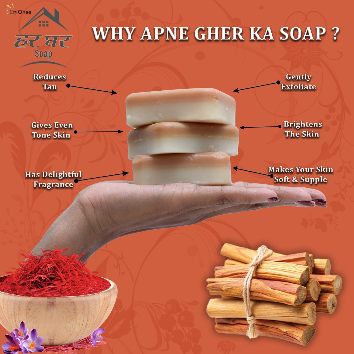 Enchanting Aroma: Immerse yourself in the captivating aroma of our Ghar Soap Sandalwood & Saffron Magic Soaps for Bath / Bath Soap. Transform your daily bathing routine into a sensory delight with the soothing scents of chandan (Sandalwood) and kesar (Saffron). Let the enchanting fragrance envelop you, creating a truly luxurious and indulgent experience with every lather.