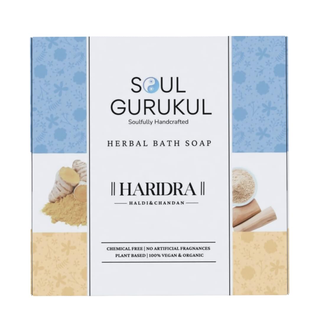 Experience the ancient wisdom of Ayurveda with this soulfully handcrafted Haridra bath soap. Combining the potent properties of Haldi (turmeric) and Chandan (sandalwood), this luxurious bathing bar offers a natural cleansing experience. The soap is completely plant-based and crafted without any artificial fragrances or harsh chemicals, making it suitable for all skin types. Each bar is thoughtfully formulated using traditional ingredients that have been treasured in Indian skincare for centuries. The 100% vegan and organic formulation ensures you’re treating your skin to pure, natural goodness. The harmonious blend of turmeric and sandalwood creates a gentle, aromatic experience while cleansing. Perfect for those seeking a chemical-free alternative to conventional soaps, this handcrafted bar brings the authenticity of traditional Indian herbs to your daily bathing ritual.