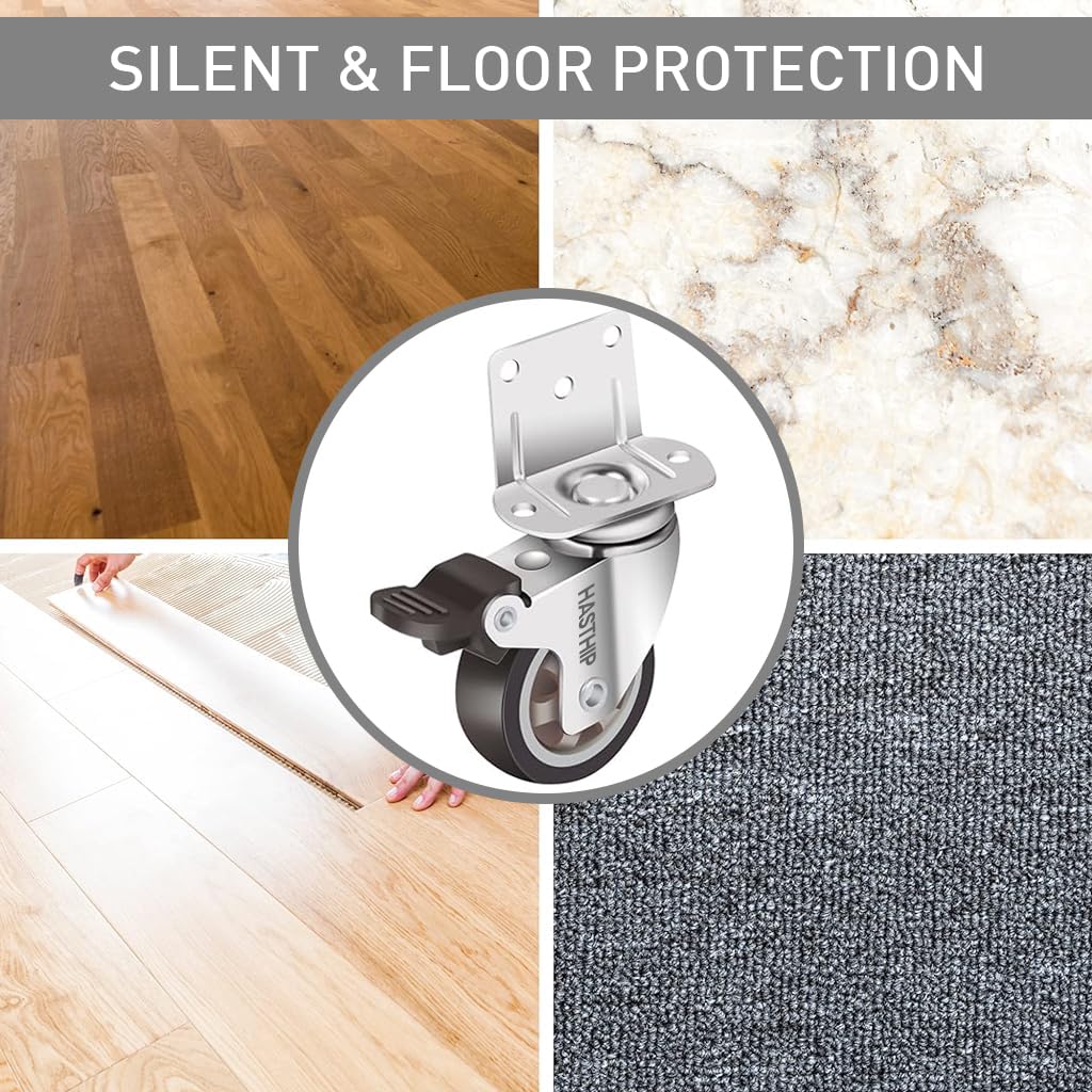 SILENT OPERATION: Our 2-inch L-shaped table casters are crafted from superior thermoplastic rubber, offering not just smooth and silent movement across various surfaces, including carpets, but also ensuring no scratches on wooden floors.