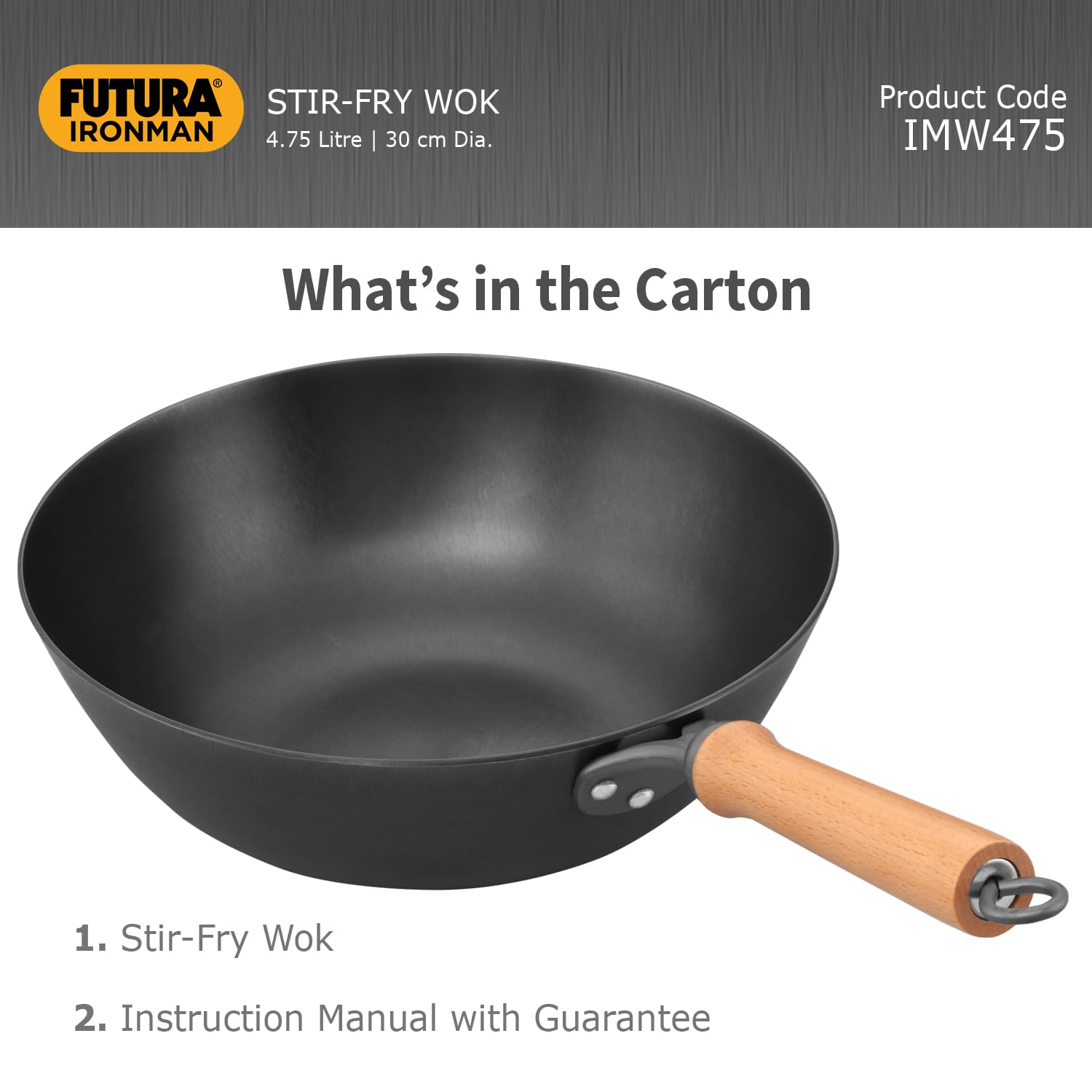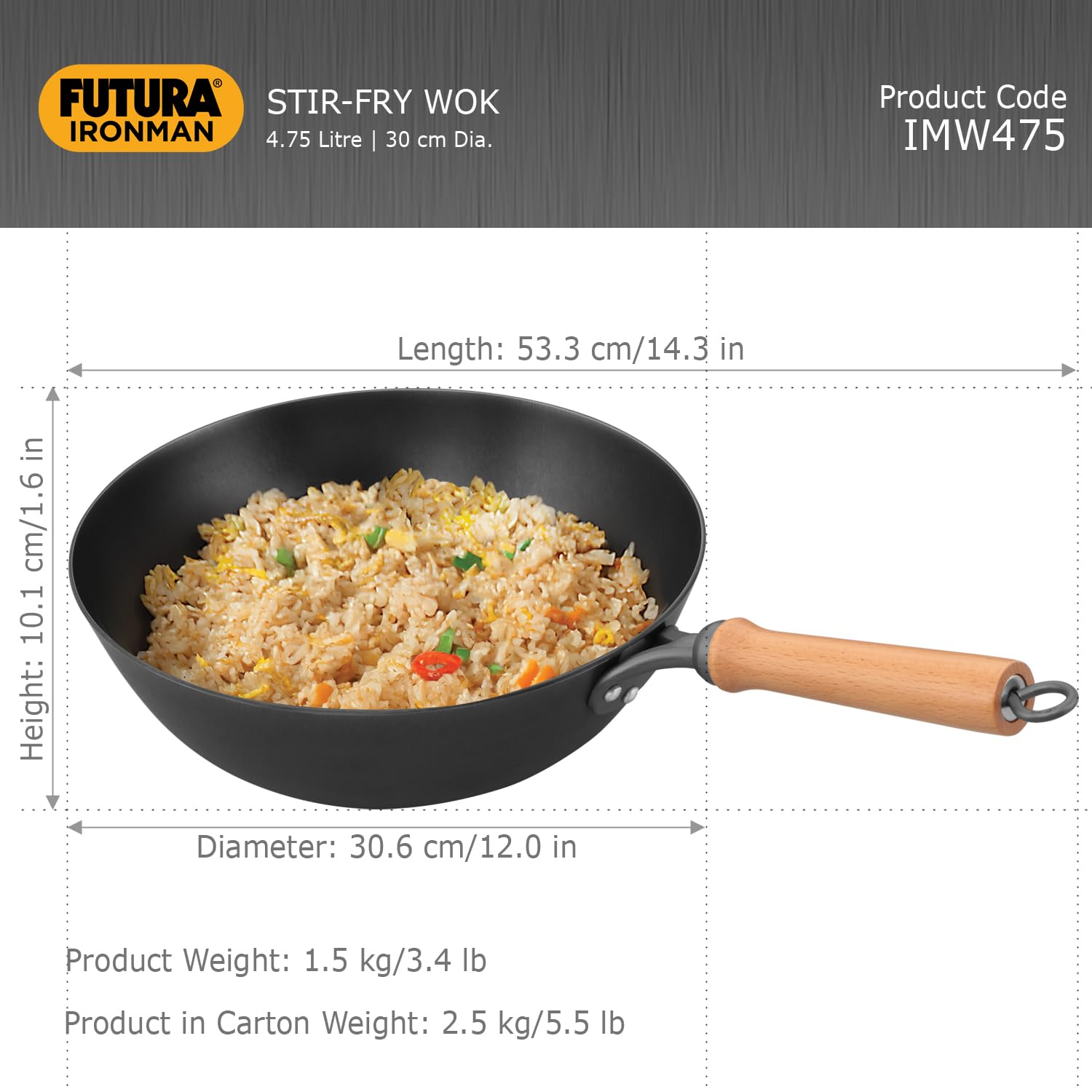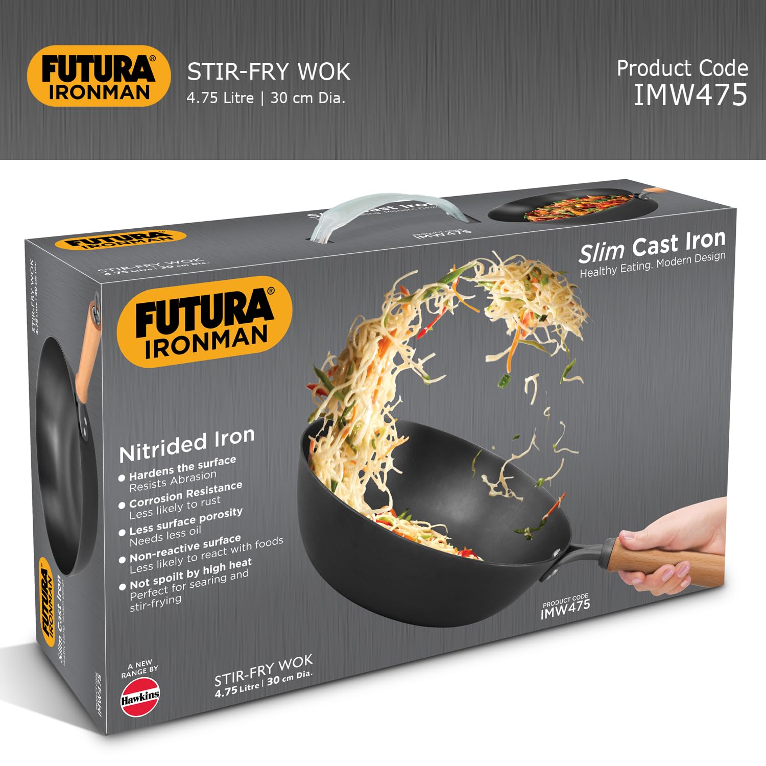 The Hawkins Futura Ironman 4.75 Litre Slim Cast Iron Stir-Fry Wok (IMW475) combines the strength of cast iron with a lighter, easy-to-handle design. Made with nitrided iron, it has a hardened surface that resists abrasion, is corrosion-resistant, and less likely to rust. Its low-porosity surface needs less oil, while the non-reactive finish ensures food retains its natural taste. Perfect for searing & stir-frying, this pan withstands high heat without damage. Built to last for years, this slim cast iron frying pan is durable, versatile, and designed for healthy everyday cooking.