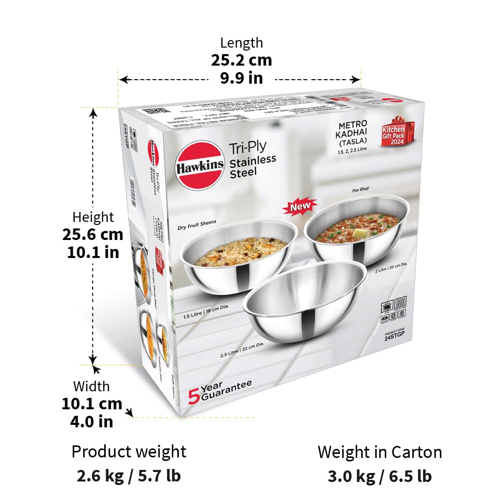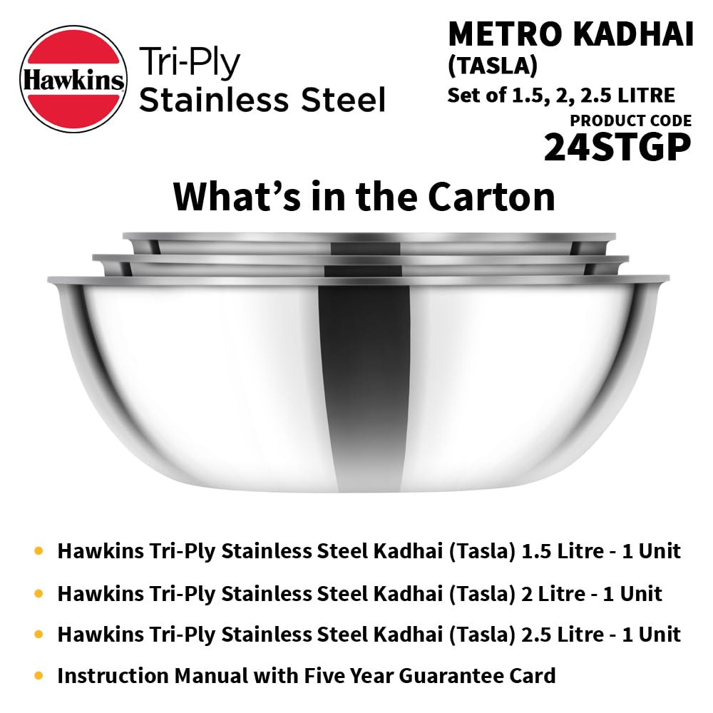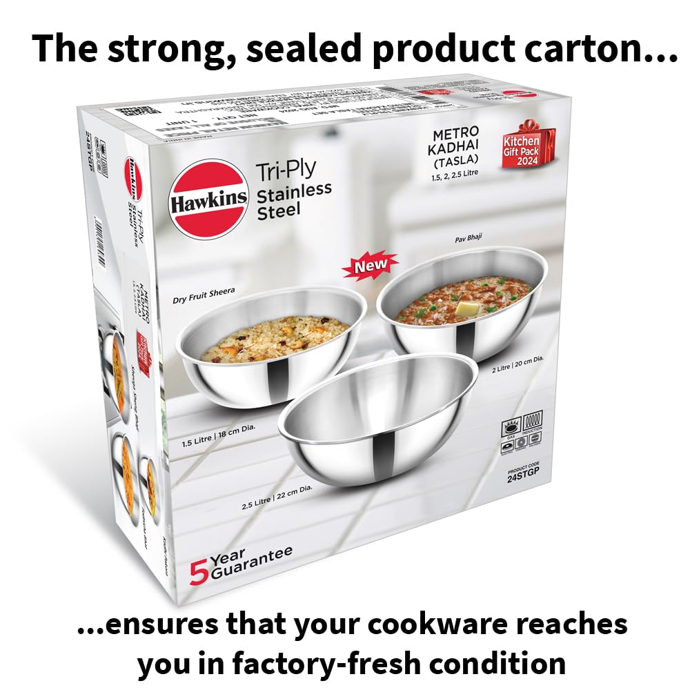 Home Accessories Hawkins Kitchen Gift Pack 2024, Set of 1.5 Litre, 2 Litre and 2.5 Litre Triply Stainless Steel Metro Kadhai, Tasla, Kadai, Silver (24STGP)