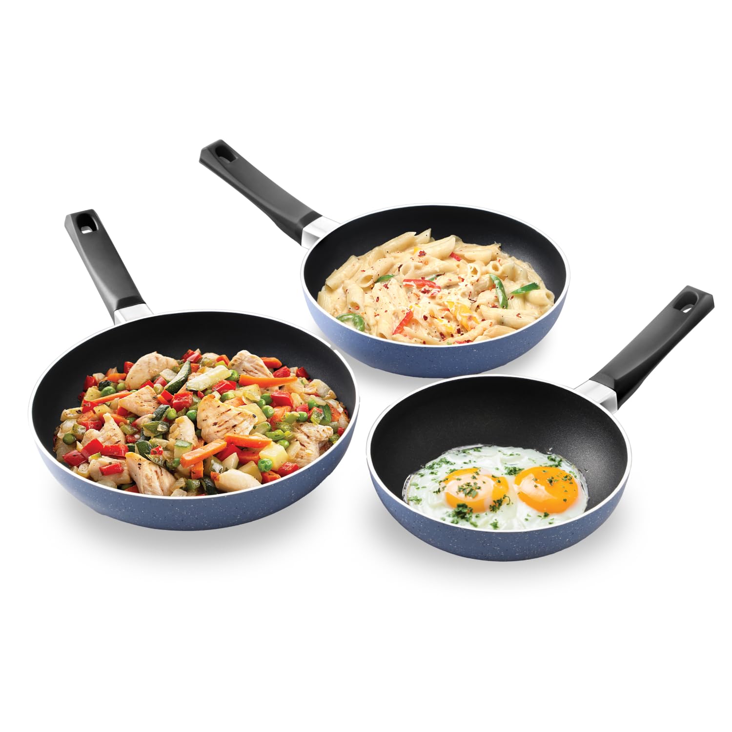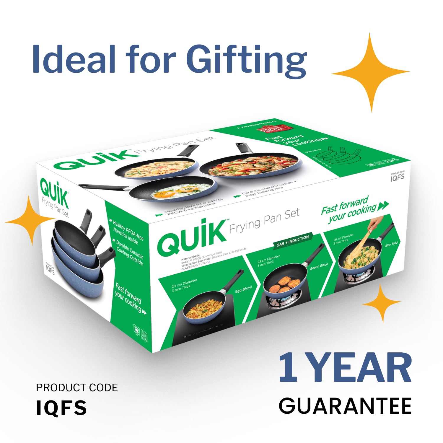 Hawkins Quik Frying Pan Set (IQFS) is a stylish and versatile 3-piece kitchen gift pack with 20cm, 23cm, and 25cm pans in elegant grey. The healthy, PFOA-free nonstick interior enables low-oil cooking, while the durable ceramic-coated exterior stays looking new for years. Its deep shape is perfect for stir-frying, tossing, and cooking in larger quantities. The rivet-less surface ensures easy stirring and effortless cleaning. With a 3mm thick base, food cooks evenly without burning or sticking. Compatible with both gas and induction cooktops, this set is ideal for everyday cooking.