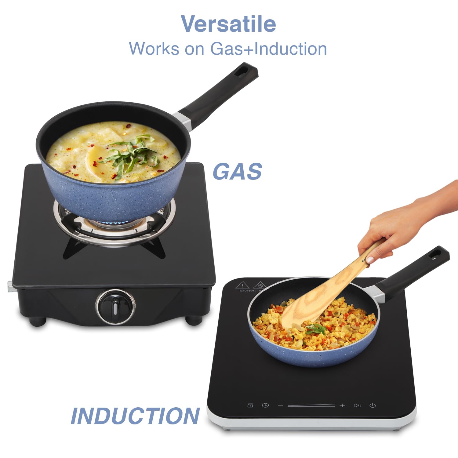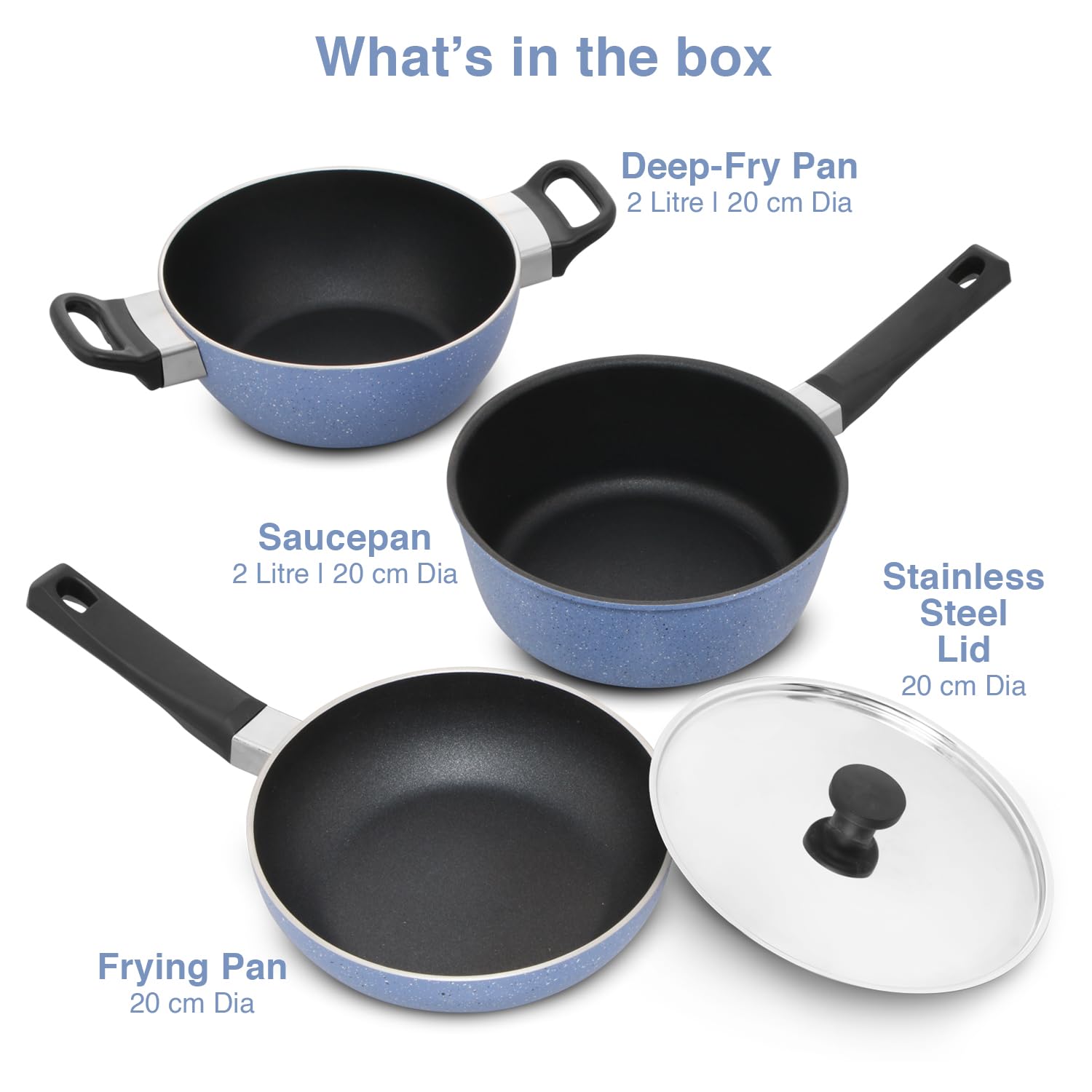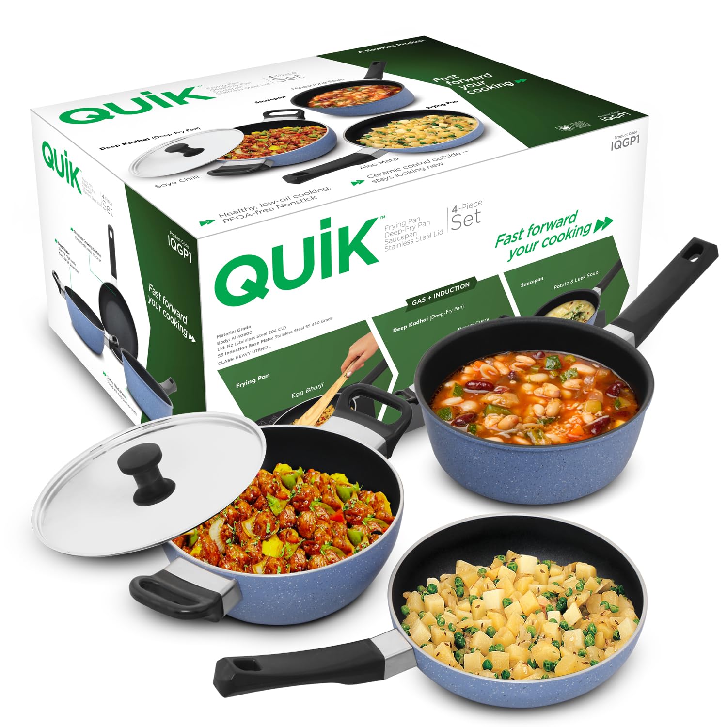 Hawkins Quik Nonstick Induction 4-Piece Cookware Set (IQGP1) is designed for healthy, hassle-free everyday cooking and gifting. The PFOA-free nonstick interior enables low-oil cooking, while the durable ceramic-coated exterior stays looking new for longer. Built with 3mm thick pans, the cookware ensures even heat distribution so food does not burn or stick. The rivet-less cooking surface makes stirring effortless and cleaning quick. Its deep, high-wall design is ideal for stir-frying and cooking larger quantities with ease. Compatible with both gas and induction cooktops, this versatile cookware set comes securely packed in an attractive box, making it perfect for festive gifting or kitchen upgrades. The Set consists of Deep Kadhai (2L), Frying Pan (20cm), Saucepan (2L) and Stainless Steel Lid (20cm).