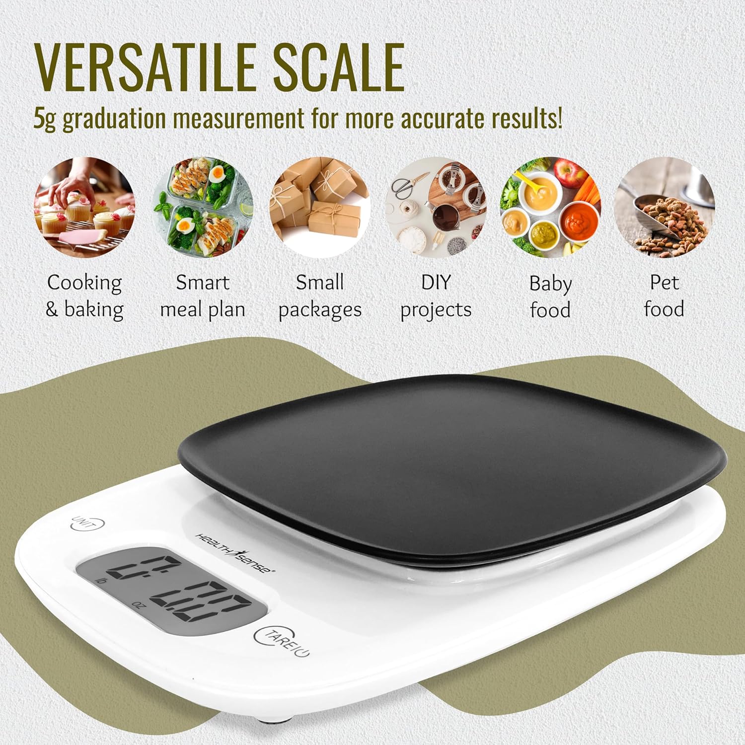 PRECISE MEASUREMENTS: Built with high precision sensors to quickly deliver accurate results & ensure your healthy recipe is deliciously perfect. Measures in grams/ml(water)/ ml(milk)/lb:oz/fl oz with range 1g-5000g