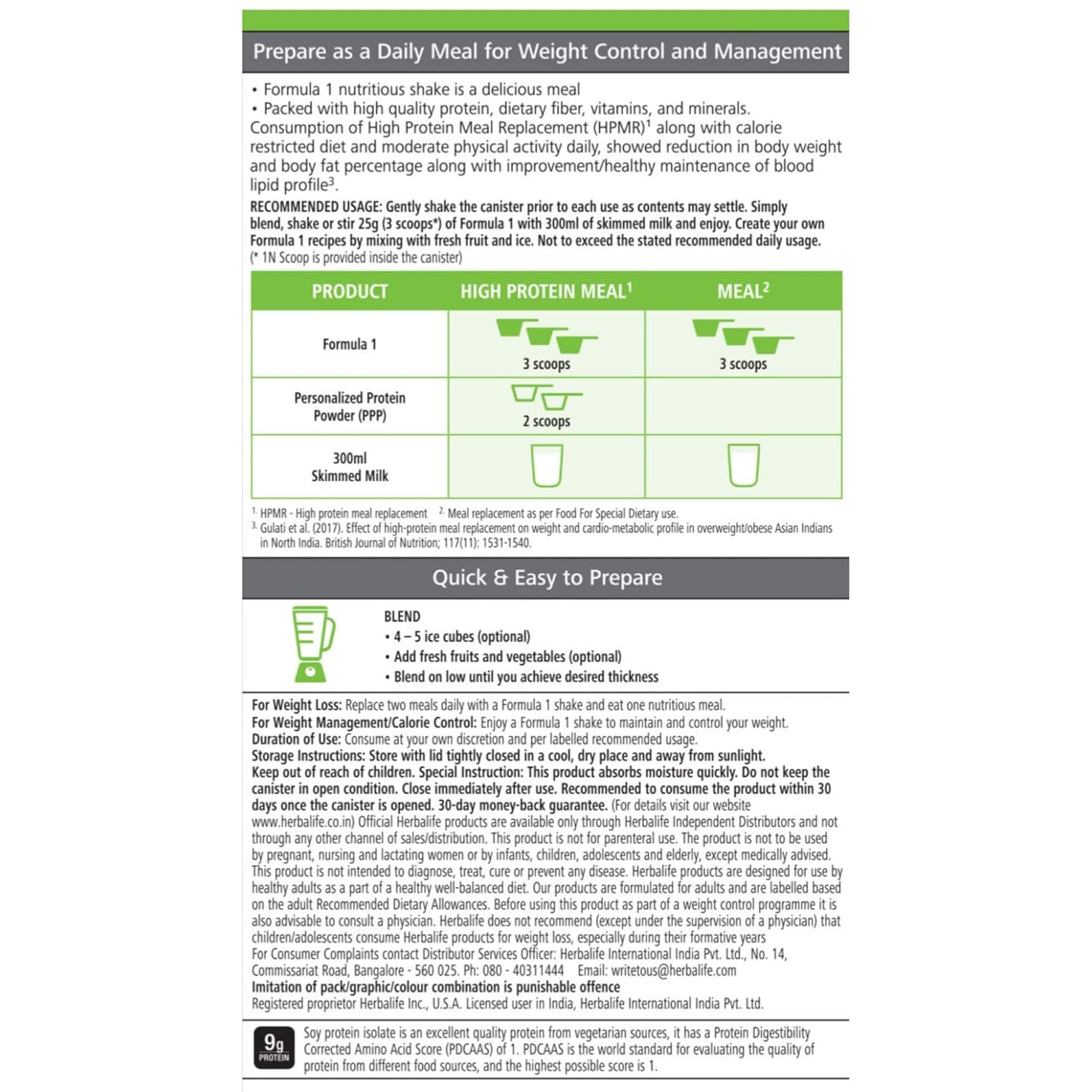 Formula 1 Nutritional Shake Mix Formula 1 Nutritional Shake mix makes a great tasting shake, specifically formulated with all necessary quality soy protein isolate, as Nutritional Food product for nutritional requirements. Packed with vitamins & minerals along with natural herbs, antioxidants and dietary fiber, it provides desired protein and nutrition without overloading unnecessary fat and calories. Enjoy Formula 1 shakes once or twice a day along with portion controlled nutrition and exercise to help towards keeping the body fit. Low Glycemic Index food Available in 6 delicious flavors Usage Gently shake the canister prior to each use as contents may settle. Simply beat, stir or shake approximately 25g (approx. 3 tablespoons) Formula 1 with 240ml of Skimmed or soymilk. Create your own Formula 1 recipes by mixing with fresh fruit and ice. Blend 1 scoop (one serving) of Personalized Protein Powder to your favorite Formula 1 shake to boost your protein intake