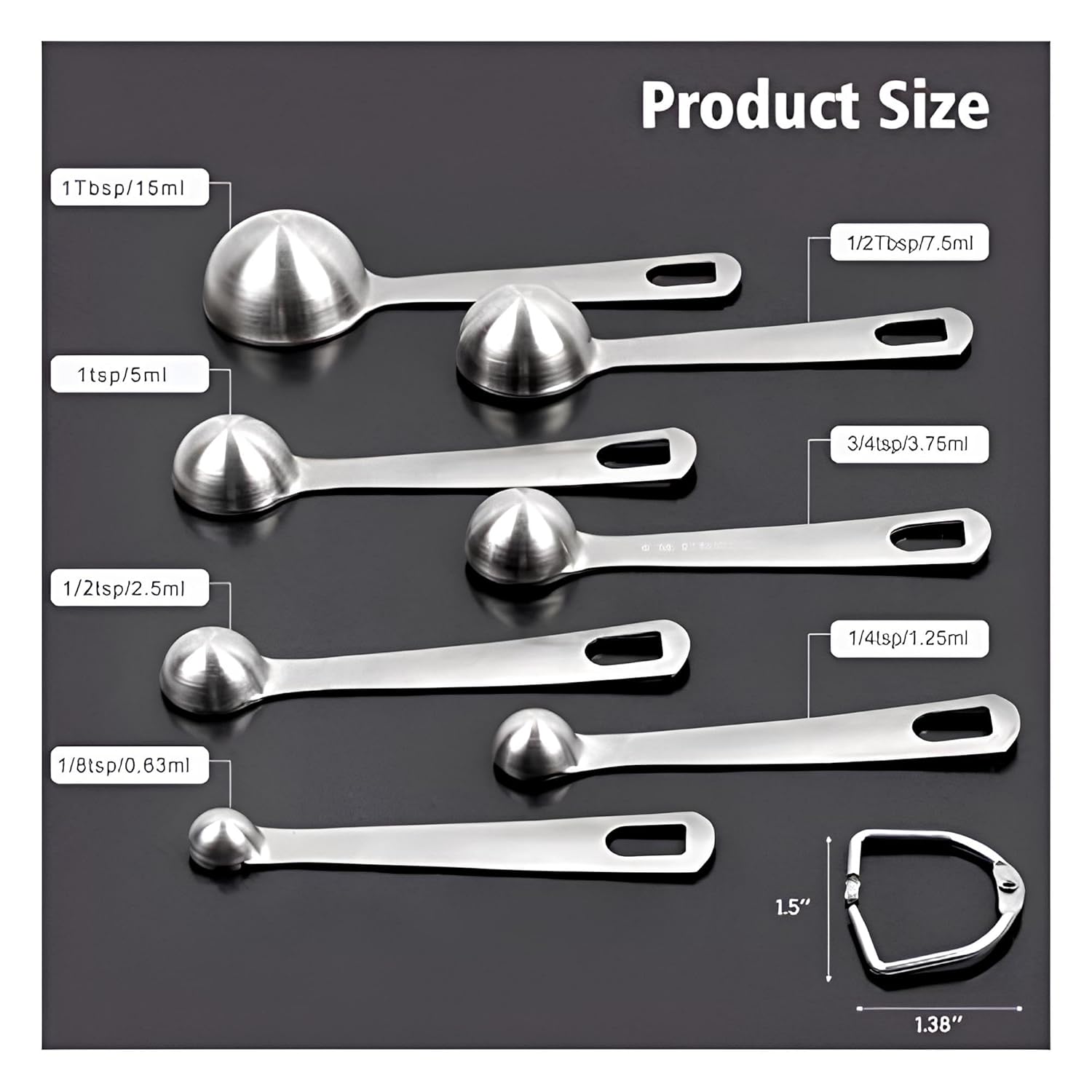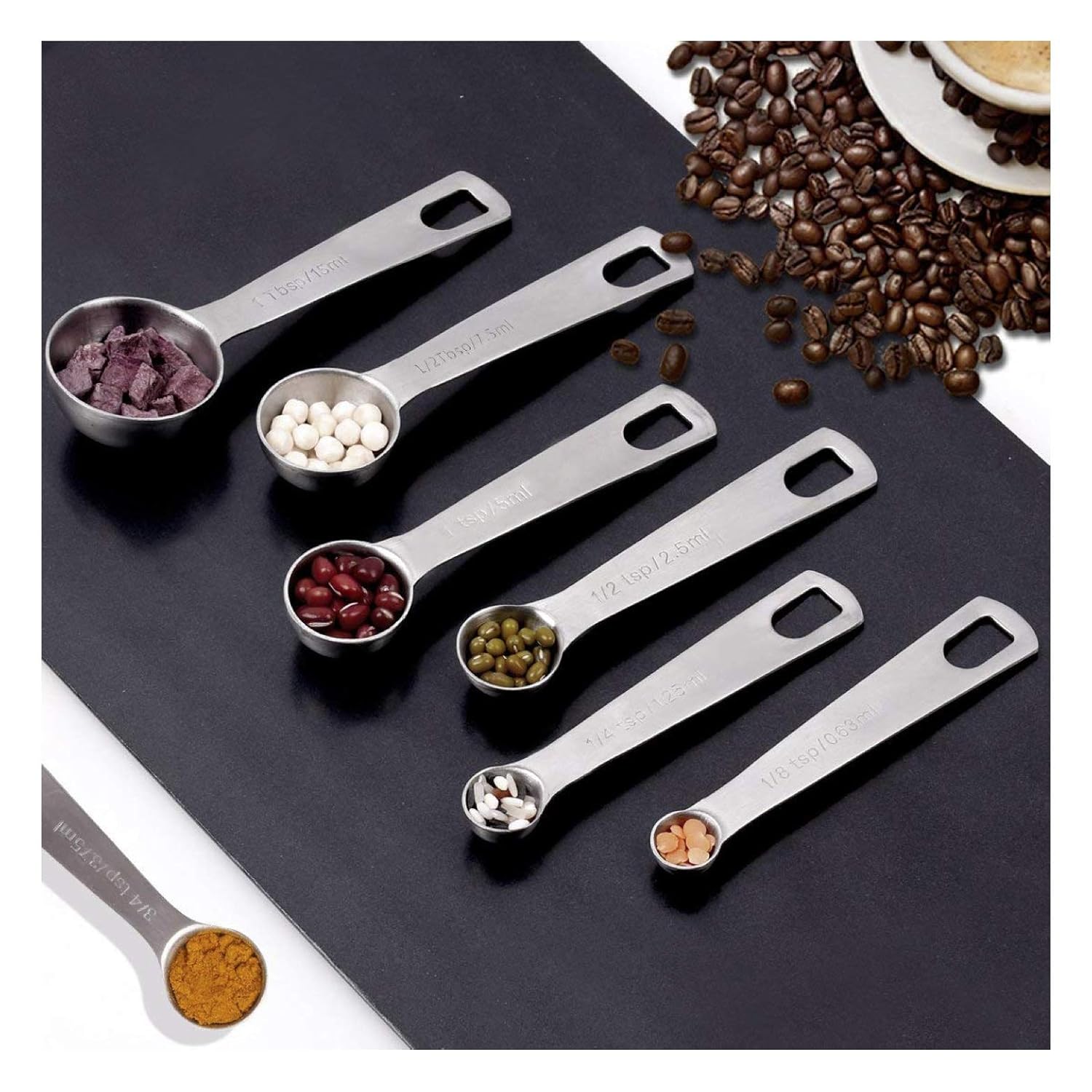 COMPLETE 7-PIECE SET: The set includes 7 essential measuring spoons: 1/8 tsp, 1/4 tsp, 1/2 tsp, 3/4 tsp, 1 tsp, 1/2 tbsp, and 1 tbsp. These cover all your measurement needs for spices, liquids, baking powders, and more. It is a versatile set perfect for every kitchen.