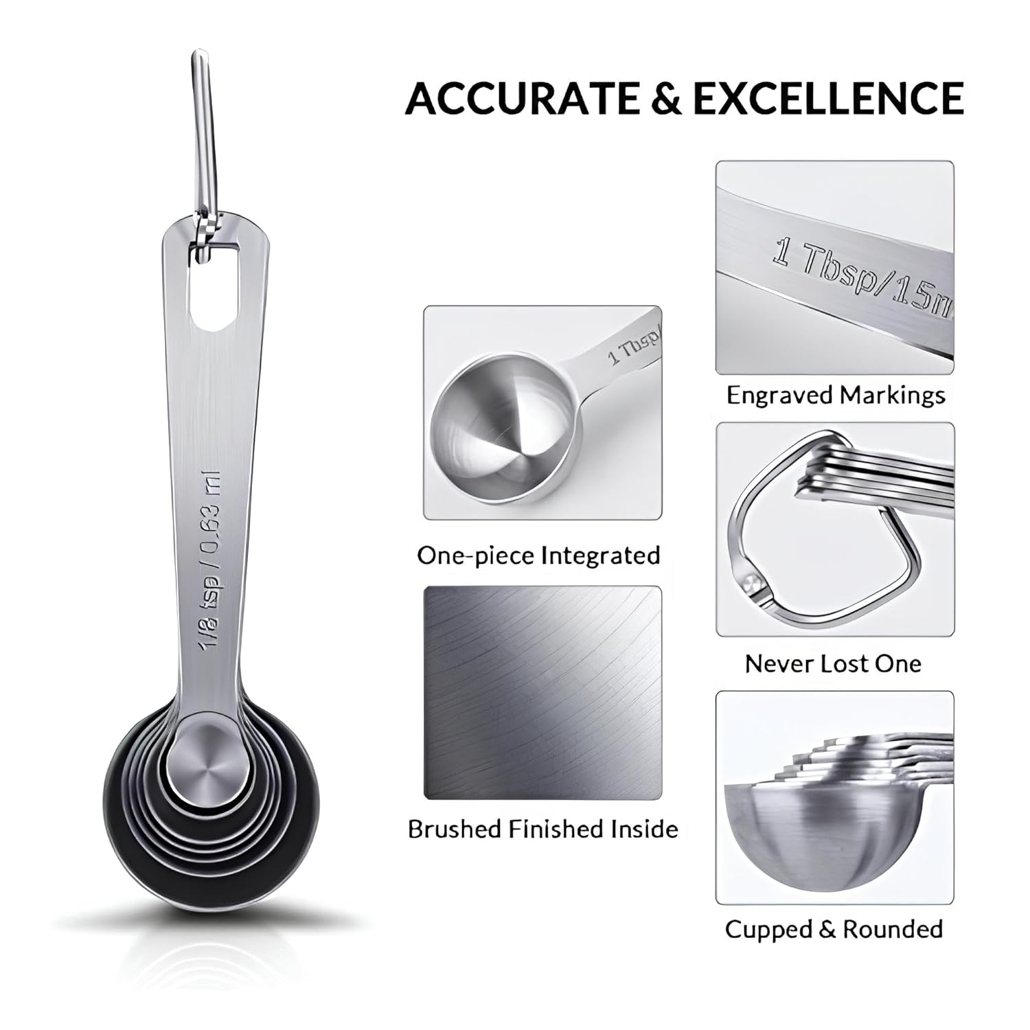 EASY-TO-READ ENGRAVED MARKINGS: Each spoon features clearly engraved measurement markings on the handle for easy identification. The markings are permanent and won’t fade, peel, or wear off over time. This ensures you always have a reliable and accurate measurement while cooking.
