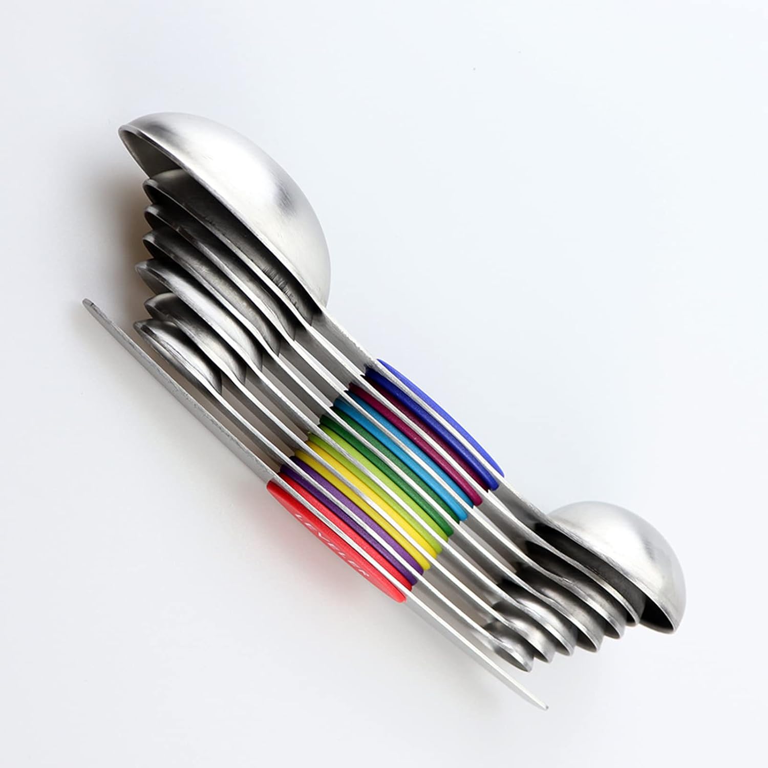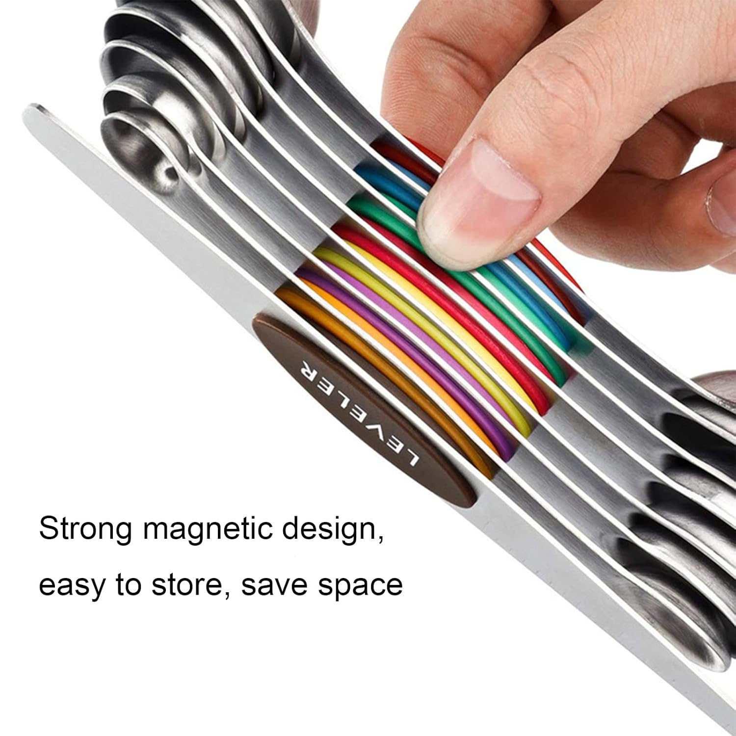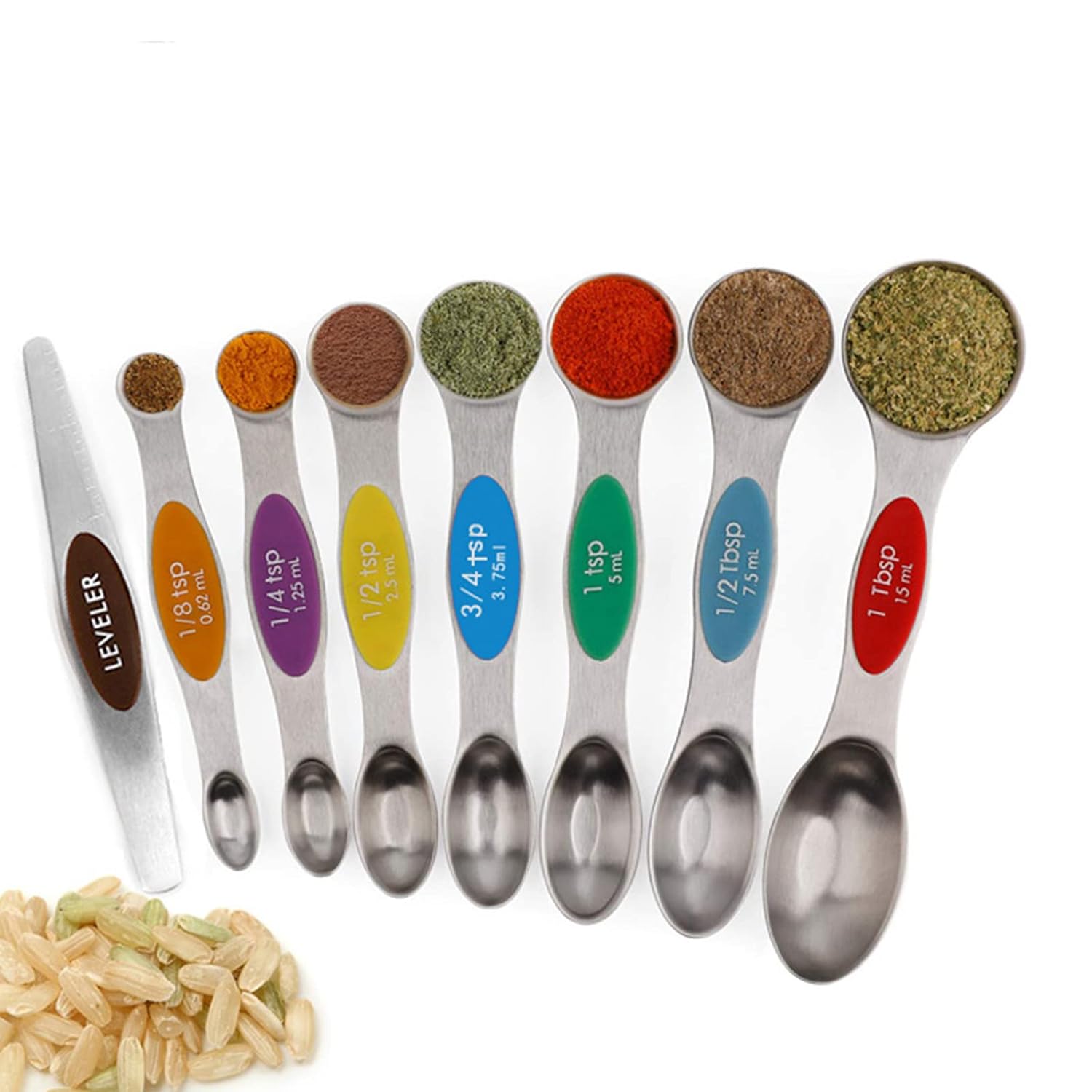 🥄【 MAGNETIC MEASURING SPOONS SET】- includes 7 pcs double sided magnetic measuring spoons and 1 pcs leveler to help you accurately measure spices. different size:1/8 tsp, 1/4 tsp, 1/2 tsp, 3/4 tsp, 1 tsp, 1/2 tbsp, 1 tbsp plus leveler. color-coded labels allow you to quickly find them while cooking,accurate and easy to read tsp/tbsp & ml measurements.