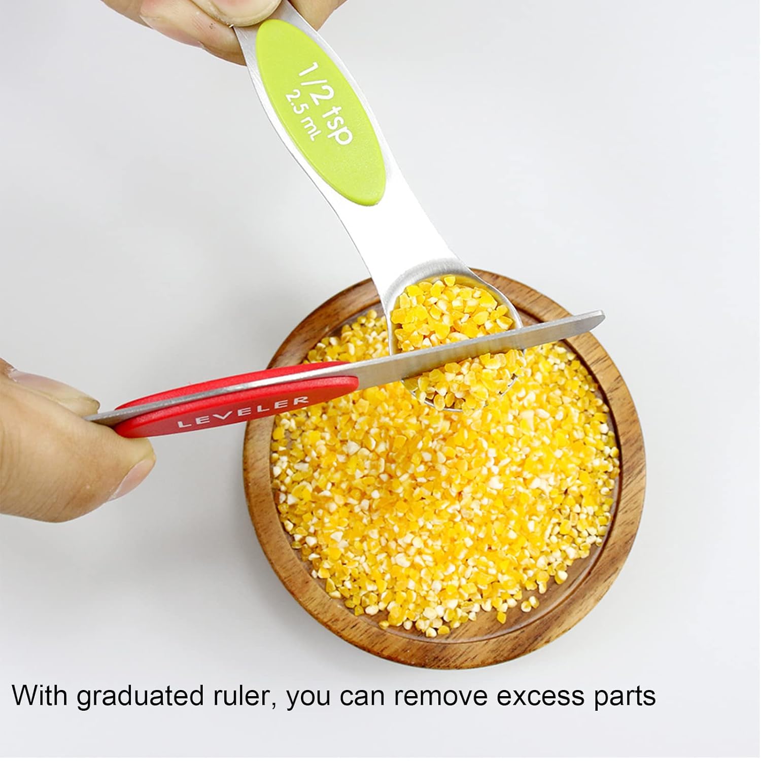 🥄【DOUBLE SIDED MEASURING SPOONS】 double ended design of the measuring spoon makes it compatible for measuring dry and liquid ingredients. the rounded end measures liquid ingredients, and the narrow oval end can be put into most spice jars or bottles. using the included leveler, you can accurately measure the amount of spices according to the requirements of the recipe, reduce the waste of expensive spices, and save valuable time.