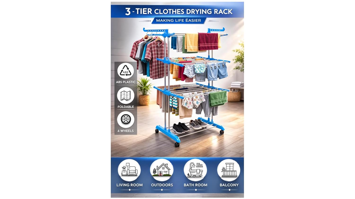 Tired of damp clothes cluttering your home and unreliable clotheslines on your balcony? Say goodbye to messy laundry days and hello to effortless organization with the iDYa 3-Layer Cloth Drying Stand. Designed specifically for modern Indian homes, this is the all-in-one solution to dry your clothes quickly, efficiently, and with minimal space. An Entire Laundry Load in One Spot Imagine a single stand that can hold everything from your daily wear and kids’ clothes to heavy towels and king-size bedsheets. With its smart 3-tier vertical design, multiple rods, and extendable hanger wings, our stand maximizes drying capacity while occupying minimal floor space. Built to Withstand, Designed to Move Crafted from high-quality, rust-proof stainless steel, this rack is your reliable partner against all weather. The smooth 360° castor wheels allow you to glide it effortlessly from your washing machine to the sunniest spot on your balcony. When the rain comes, simply roll it back inside. Your Smart, Space-Saving Solution Folds in Seconds: Finished drying? The stand collapses into a slim profile for easy storage. Quick & Simple Setup: Assemble it yourself in minutes without needing any tools. Versatile Use: Perfect for balconies, bedrooms, laundry rooms, or as an extra wardrobe. Invest in Quality. Choose iDYa. As a proud Made in India brand, we stand for durability and practical design. Stop struggling with wet clothes and start enjoying a more organized home today. Click ‘Add to Cart’ now and transform your laundry routine forever!