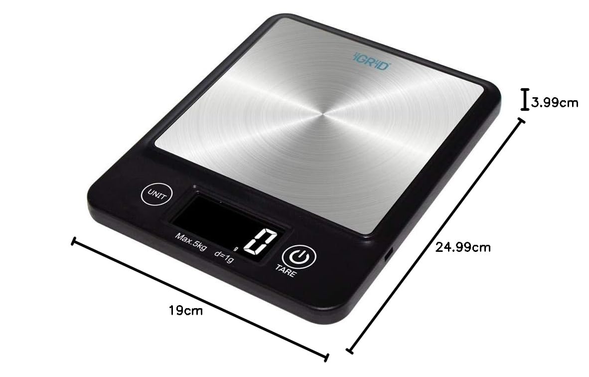 iGRiD high precision digital kitchen food scale weigh up to 5 kg Placed on a horizontal surface. Weighing modes can switch quickly and easily between grams, kilogram and pounds. It is a good home kitchen workmate, weigh grams and perfect for cooking, baking, weighing postage, jewelry and household items. The precise TARE function can reset the weight on the scales to zero. Easy to carry and storage. LED display shows the result, low battery and overload indication.