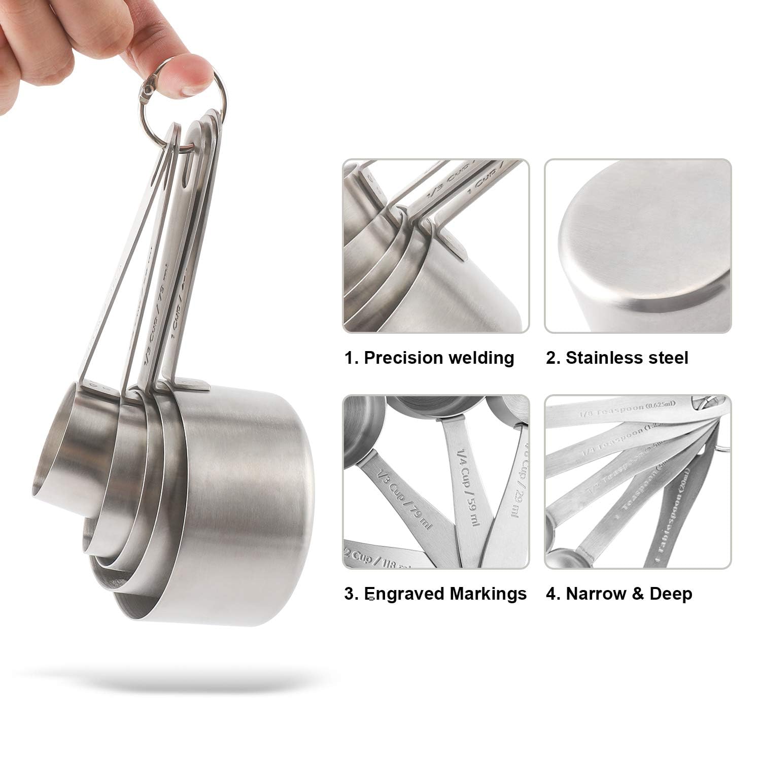COMPLETE 5 PCS CUPSET of supreme quality and sturdy stainless steel measuring cups, including 30ML (1/8Cup), 60ML (1/4Cup), 80ML (1/3Cup), 125ML (1/2Cup) and 250ML (1Cup) and COMPLETE 5 PCS Measuring Spoon Set of high quality and sturdy stainless steel measuring spoons with ring , includes: 1/8 TSP(0.63 ml), 1/4 TSP(1.25 ml), 1/2 TSP(2.5 ml.) , 1 (5 ml.) teaspoon, and 4 TSP(20 ml.) tablespoon