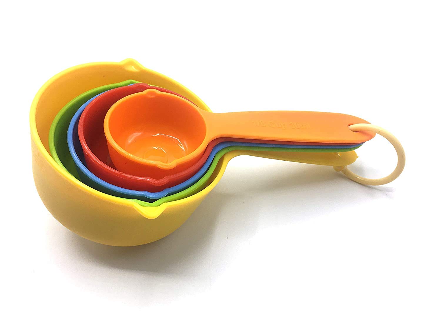 10 measuring cups and spoons in a ring holder. Accurately measure solid and liquid food ingredients for cooking and baking.