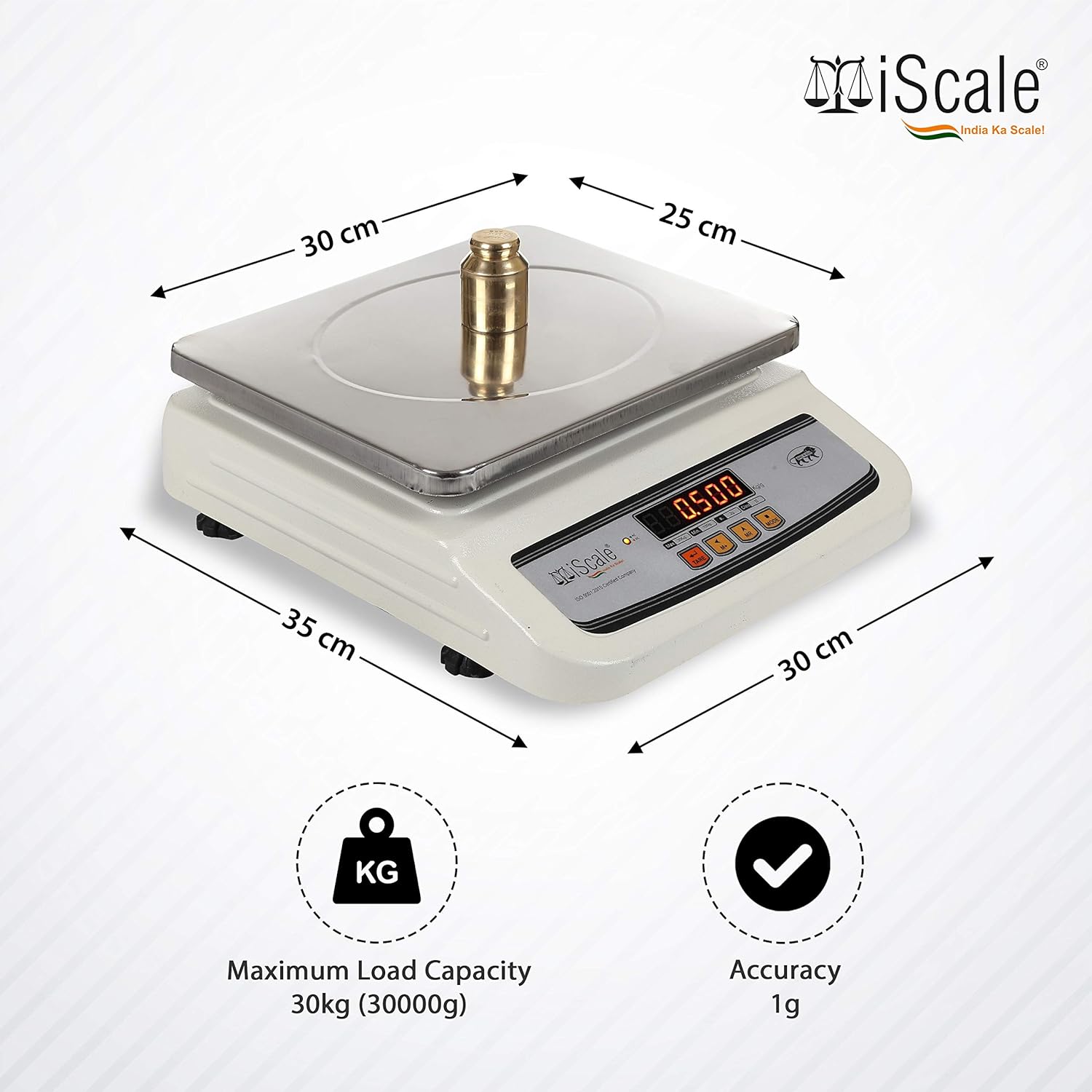 Platform measures 10 inches x 12 inches. Maximum Weighing capacity: 30 kg, Precision: 1 gram. Comes with Stamping & Calibration certificate provided by Legal Metrological department of India.