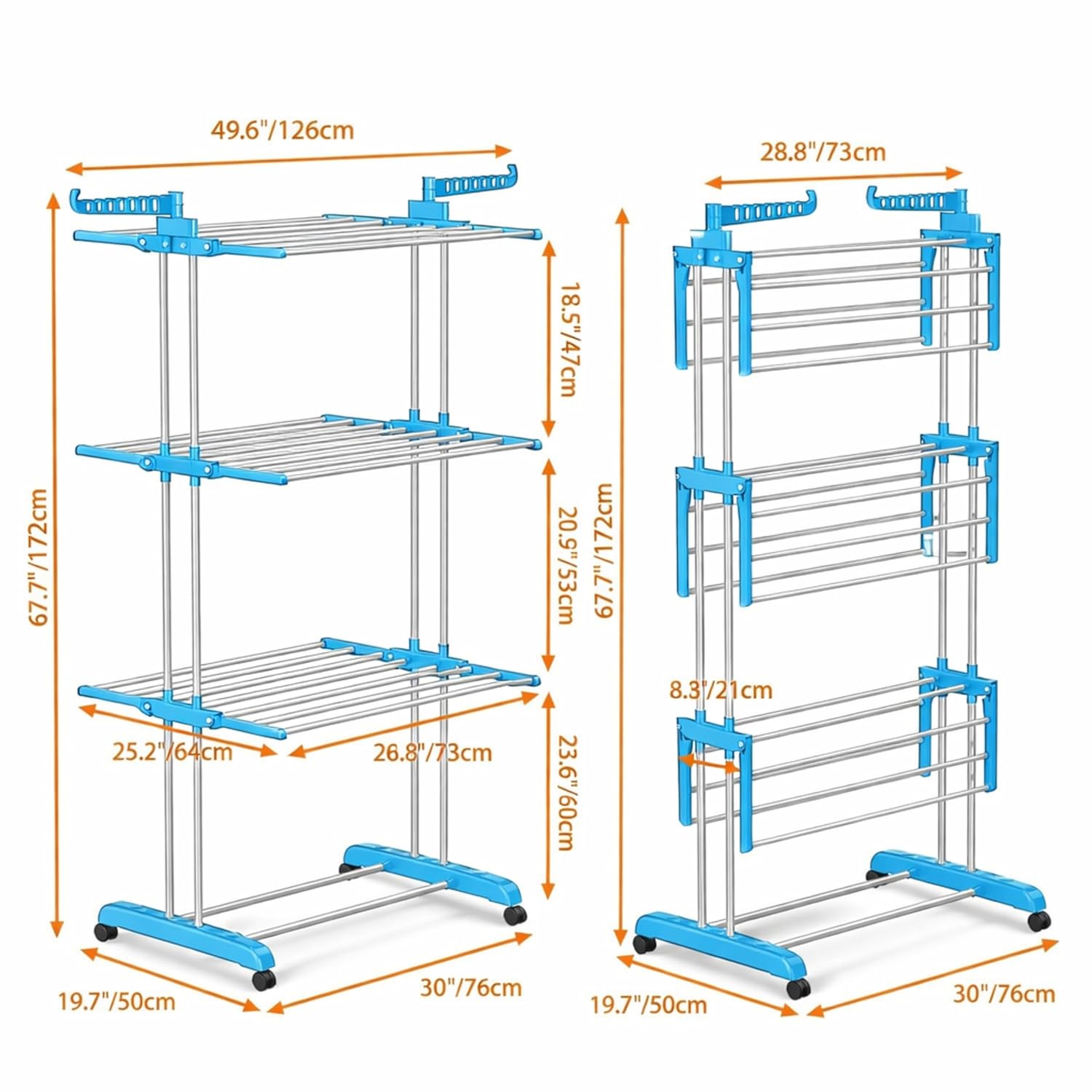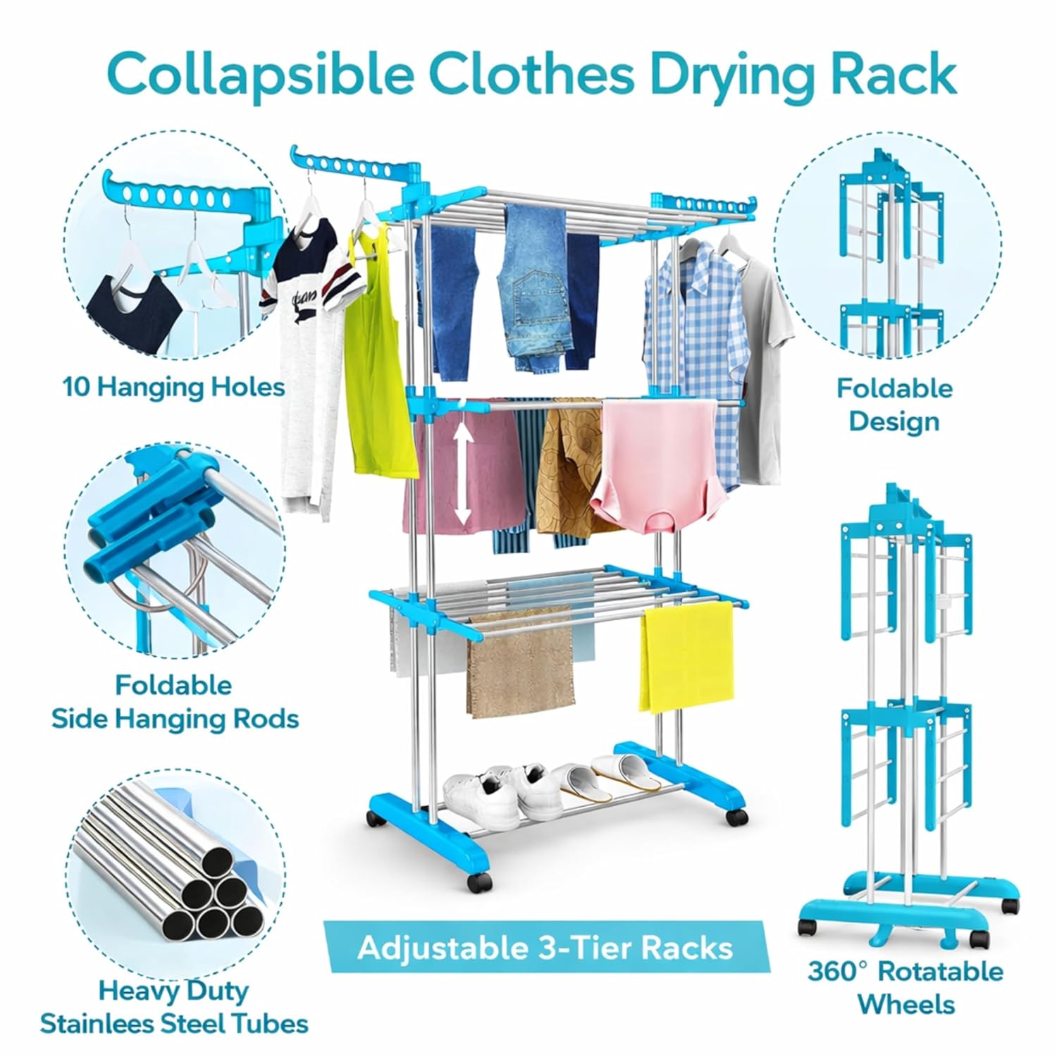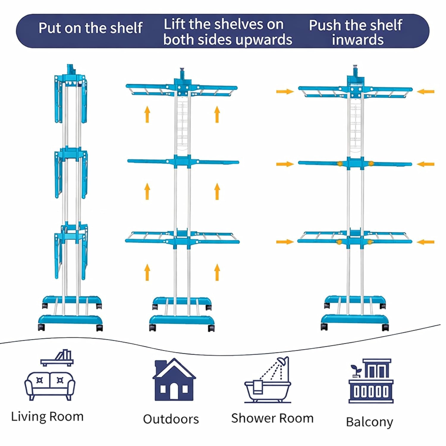 ✅ 𝐅𝐨𝐥𝐝𝐚𝐛𝐥𝐞 𝐂𝐥𝐨𝐭𝐡𝐞𝐬 𝐃𝐫𝐲𝐢𝐧𝐠 𝐒𝐭𝐚𝐧𝐝 – A durable, 3-tier cloth stand for drying clothes foldable and portable; perfect for indoor & outdoor use with smooth wheels.