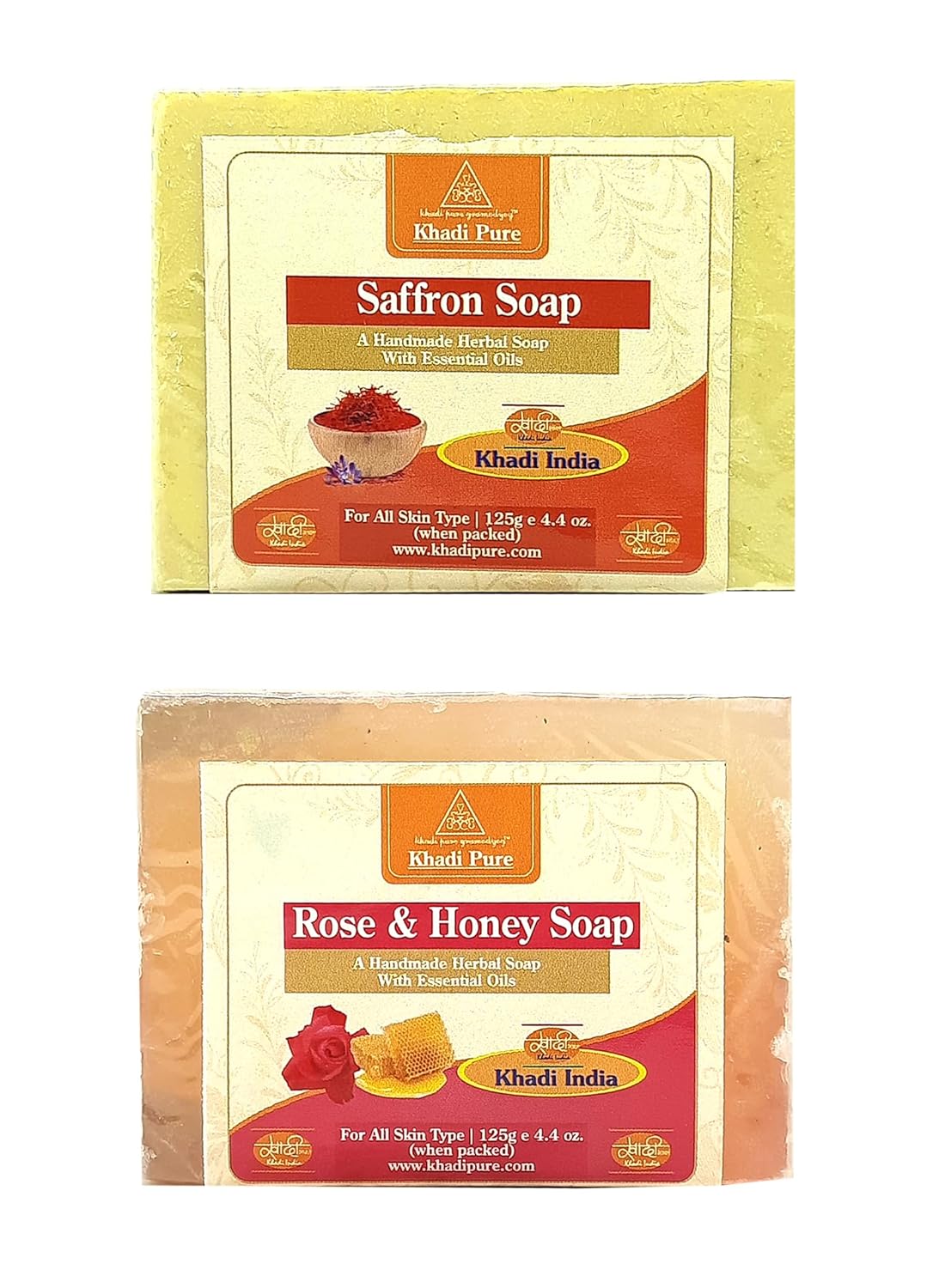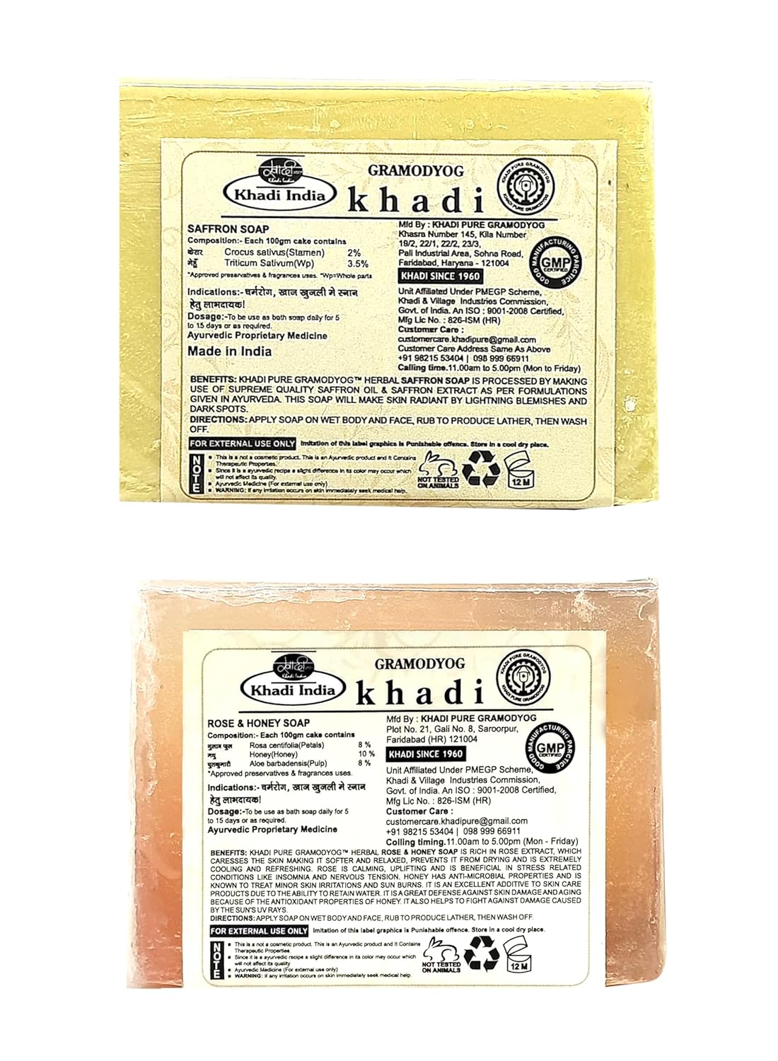Khadi Pure Gramodyog™ Herbal Saffron Soap is processed by making use of supreme quality saffron oil & saffron extract as per formulations given in Ayurveda. This soap will make skin radiant by lightning blemishes and dark spots.Khadi Pure Gramodyog™ Herbal Rose & Honey with Rose Petals Soap wrapped inside the petals of rose and honey, this wonderful soap calms and uplifts your senses and relieves you from stress and insomnia. Honey cleanses your skin and protects it from skin damages. It acts an anti-oxidant and fights against free radicals that cause ageing.