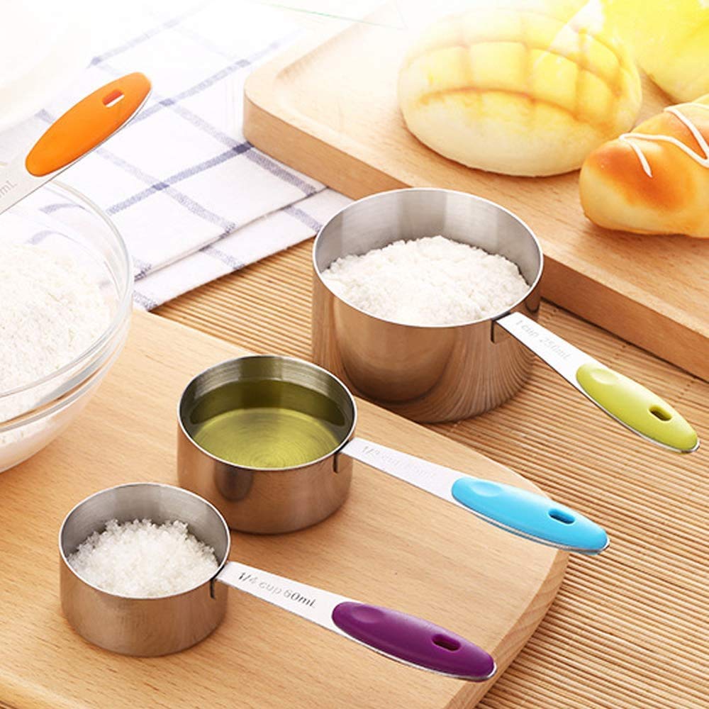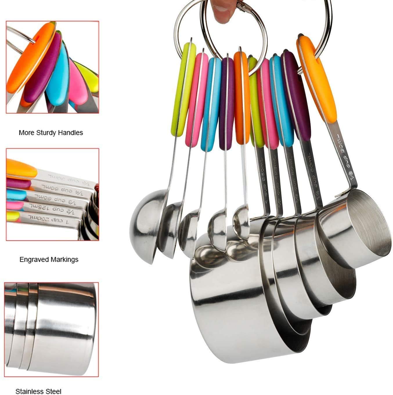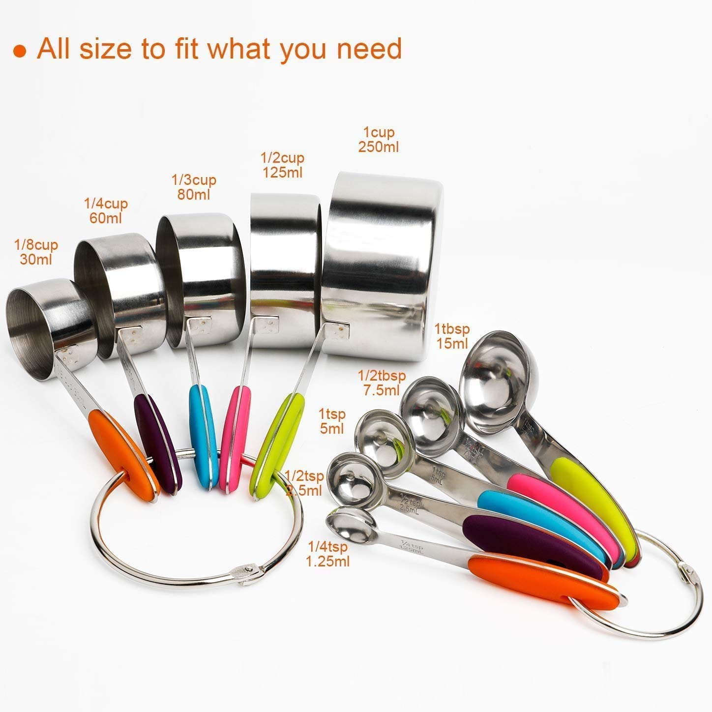 COLORFUL NON-SLIP HANDLES: With bright, multi-colored silicone handles that are BPA-free for added safety, this set of rainbow measuring cups and spoons adds a fun, eye-catching look to your kitchen. On top of differentiating the sizes, the silicone also helps to ensure the cups and spoons won’t slip out of your hand