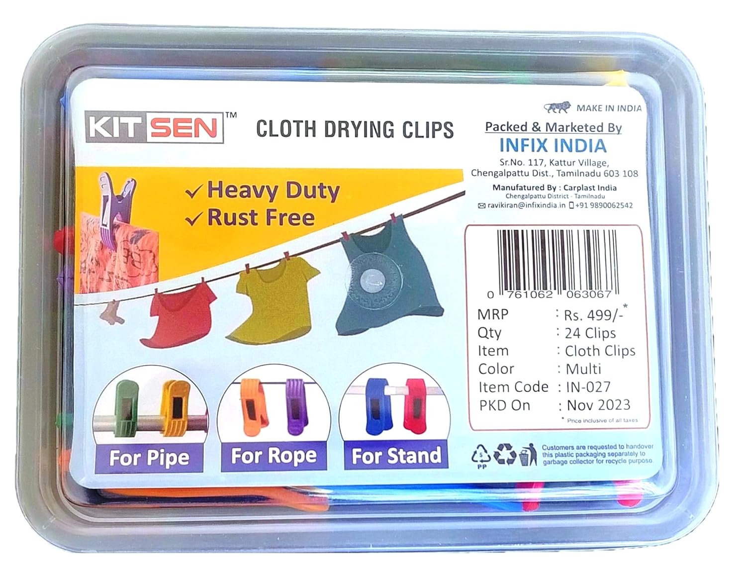 3 IN 1 SOLUTION – KITSEN Premium Cloth Drying Clips Box contains 24 cloth pegs. These premium cloth drying pegs are thoughtfully designed as ‘Three in One’ solution as you can use them on PIPE, on ROPE and on STAND.